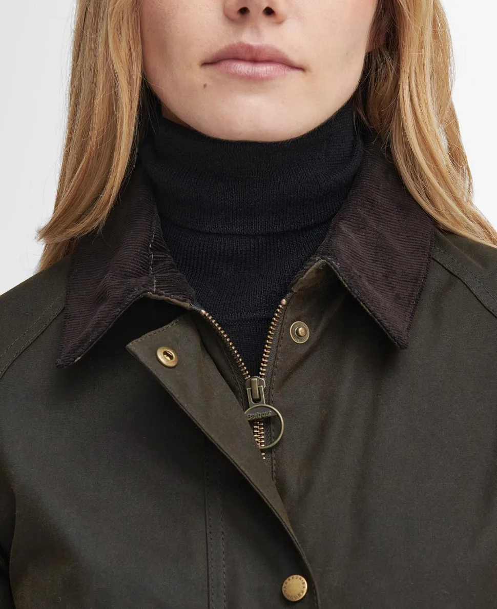 Rento ja mukava takki, jossa on vahattu puuvillapäällinen ja Barbourin ikoninen ruudullinen vuori. Tyypillisiin yksityiskohtiin kuuluvat sametti kaulus, jossa on kaulaläppä, kädenlämmittelytaskut ja alhaalla olevat paikkataskut, joita koristavat sävyyn sopiva Barbour-kirjonta.