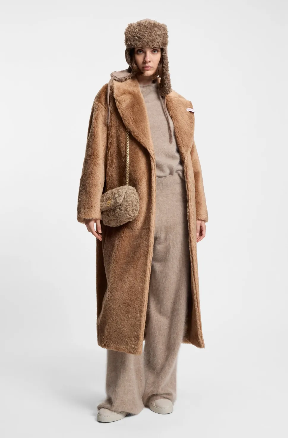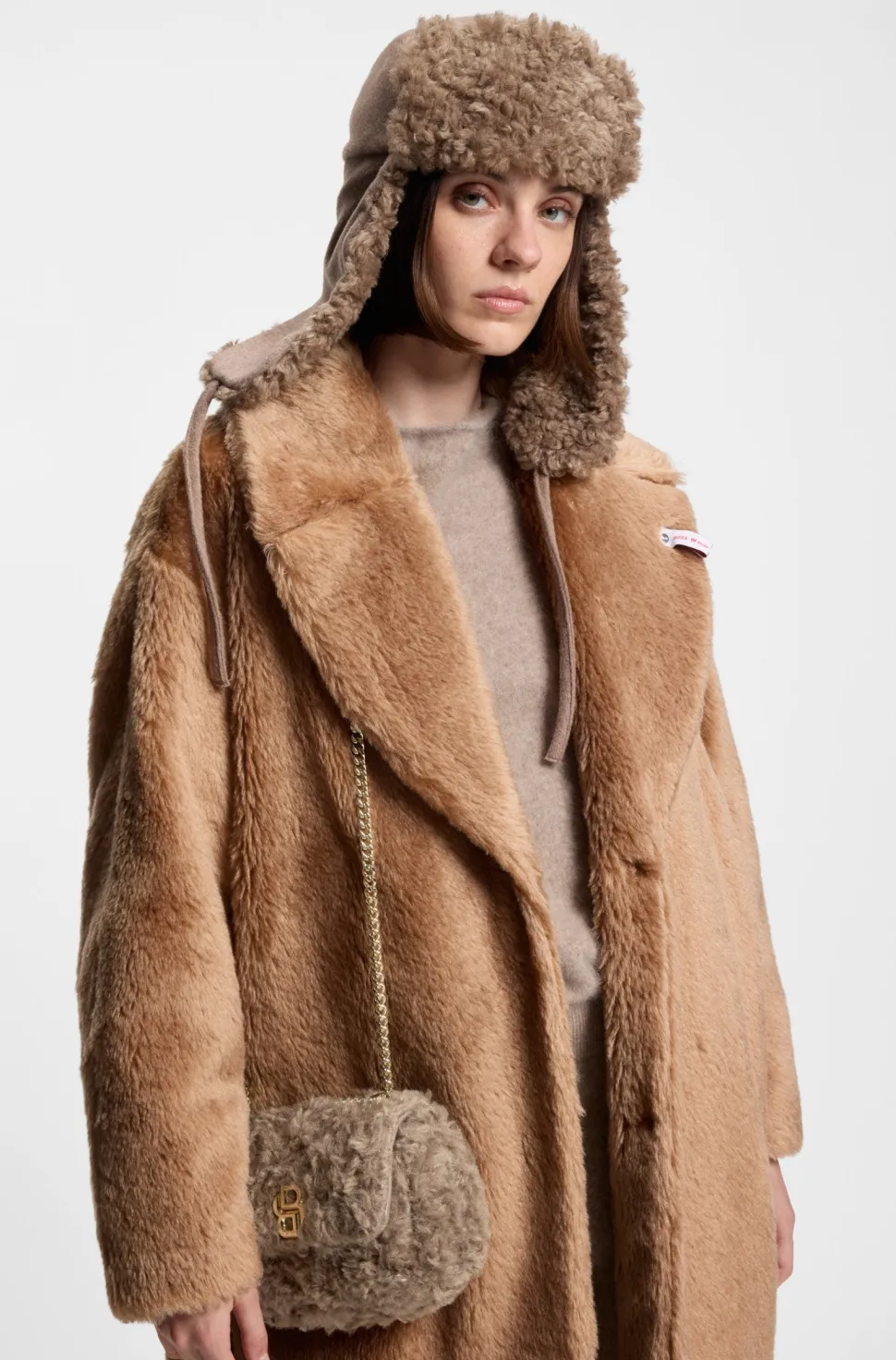 Tämä naisten BOSS-laukku on valmistettu teddy-pehmokankaasta ja villasta. Runsas topattu efekti antaa näyttävän ilmeen. Kullanvärinen tupla-B-monogrammi. Säädettävässä ketjuhihnassa on sileä reunus mukavaa käyttöä varten. Mitat: 6 x 12 x 18 cm
