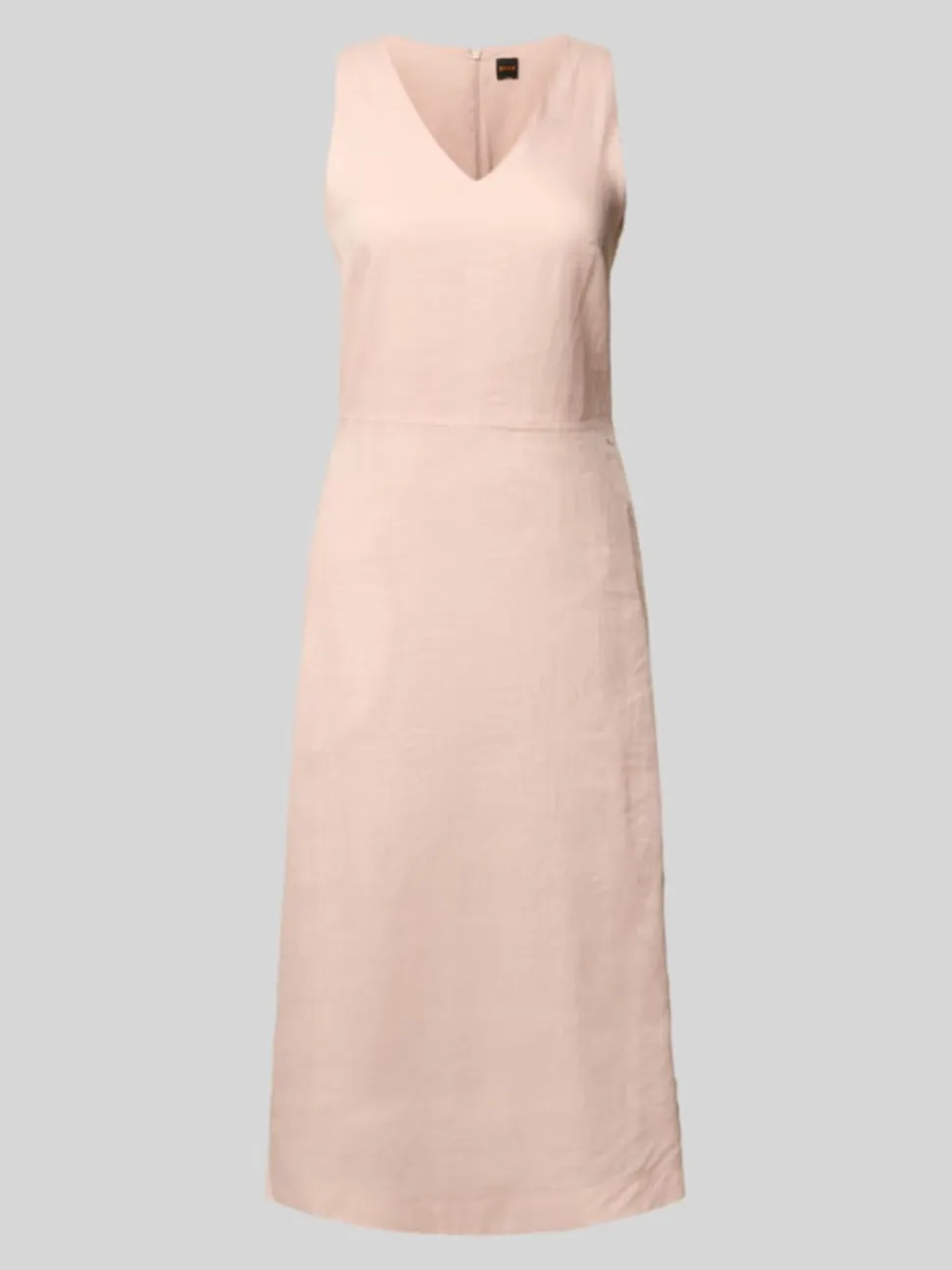 BOSS Orange midimekko halaa hellästi siluettia hieman räätälöidyllä leikkauksellaan. V-pääntie ja leveät olkaimet antavat mekolle tyylikkään ilmeen, kun taas laadukas materiaali lisää mukavuutta.