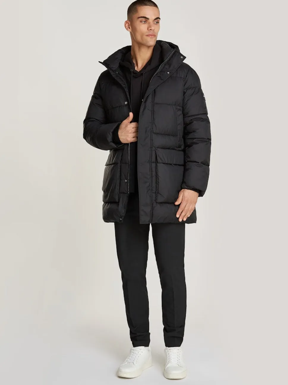 Calvin Kleinin hieman pidempi puffertyylinen toppatakki joka pitää sinut varmasti lämpimänä! Pystykaulus, kiinteä huppu ja resorilliset hihansuut.