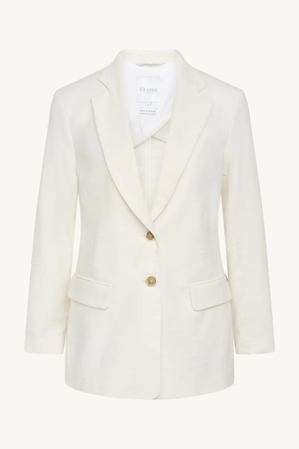 Puolivuorattu bleiseri, jossa etutaskut, topatut olkapäät ja nappikiinnitys.