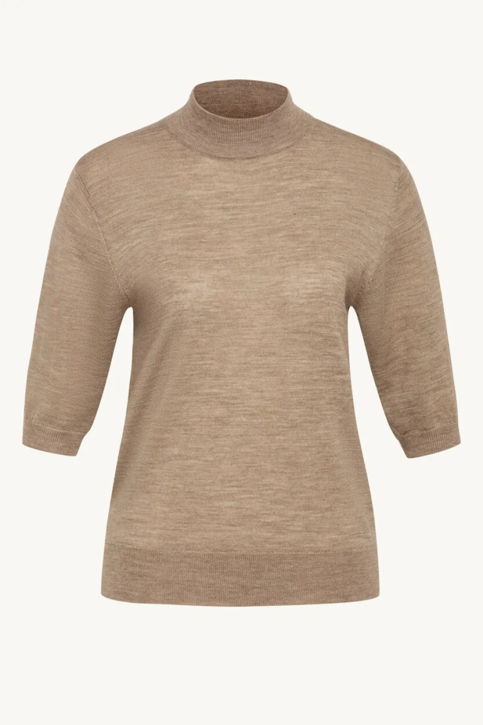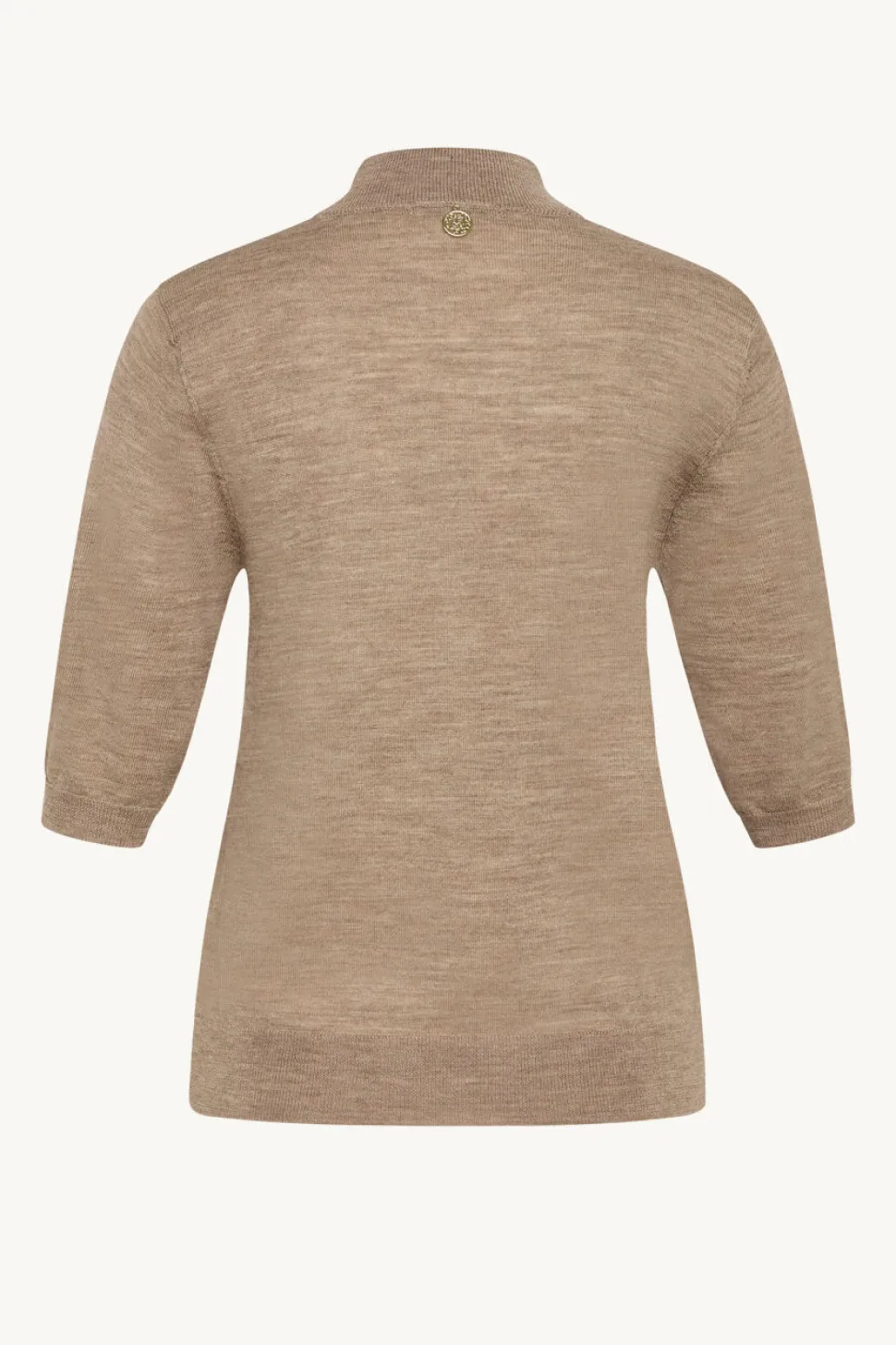 Clairen kaunis ja pehmeä neule lyhyemmillä hihoilla ja pystykauluksella, 100% merinovillaa. Viimeistelty kultaisella merkillä
