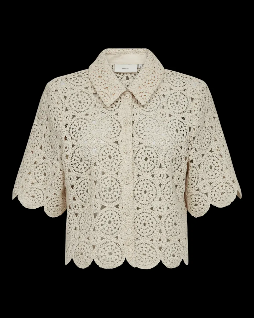 Simpukkakuvioiset reunat”>CMCROCHET-SHIRT on lyhythihainen paita ensiluokkaisesta puuvillamateriaalista, jossa on virkattu kuvio, nappikiinnitys, väljä istuvuus sekä simpukkakuvioiset reunat.
