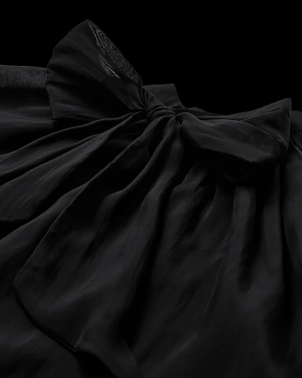 CMTILLY-BLOUSE on eksklusiivinen pusero, jossa on ylellinen, irrotettava rusettikoriste korkeassa kauluksessa, laskostetut yksityiskohdat, kangasnapeilla koristeltu halkio takana ja pitkät raglanhihat, joissa on runsas ilmapalloefekti ja nappikiinnitys.
