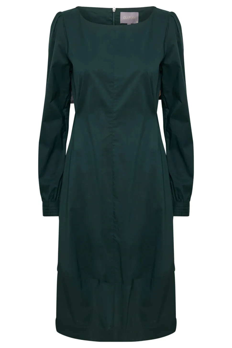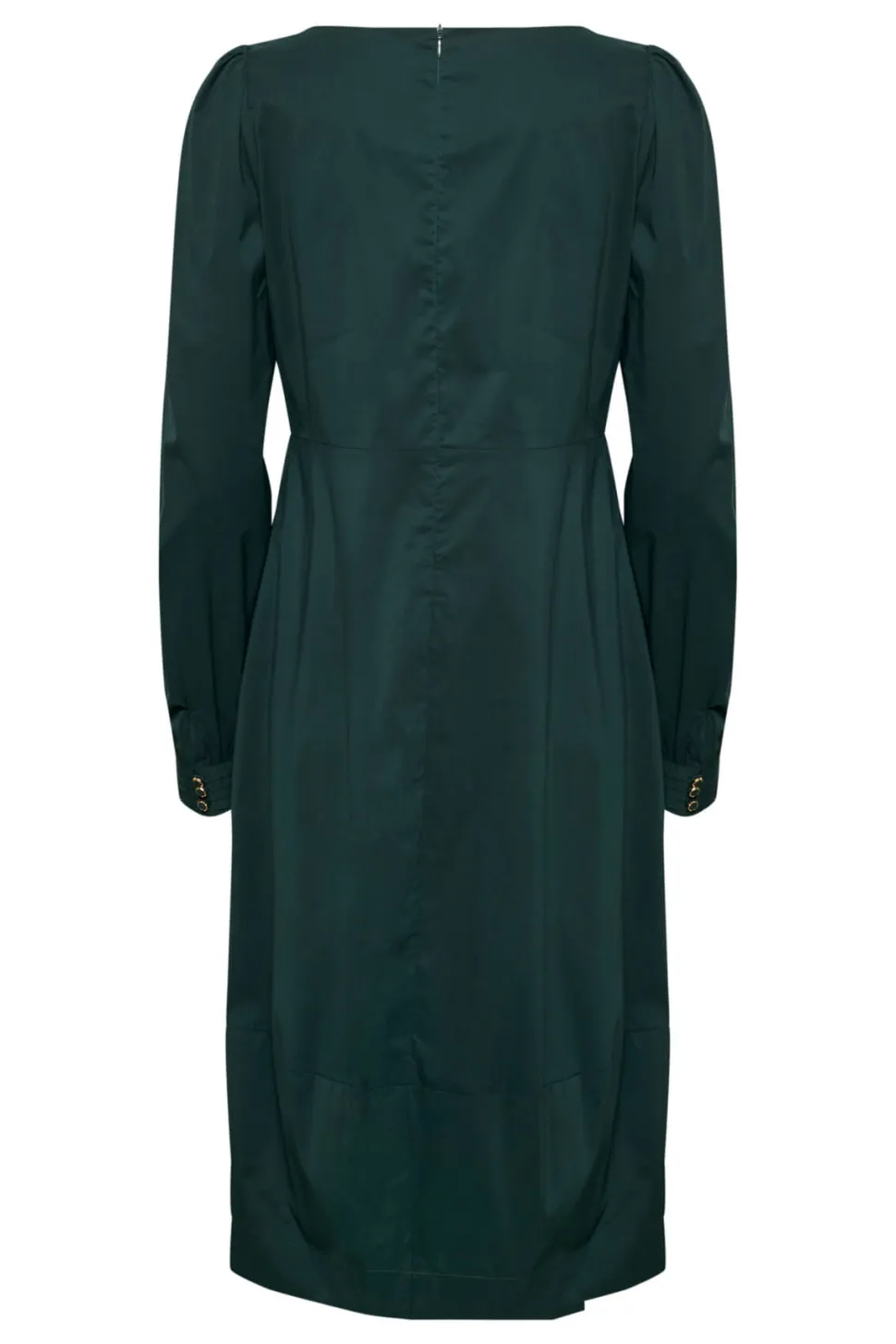 Culturen naisten tyylikäässä mekossa on pitkät hieman pussimaiset hihat, jotka on rypytetty olkasaumaan. Mekossa on pyöreä pääntie, midimittainen helma sekä vetoketjukiinnitys selässä. Hihansuissa on kauniit koristenapit. Malli on kevyesti kavennettu vyötäröltä ja mekon istuvuus on jätetty hieman väljäksi. Materiaali on pehmeää ja joustavaa puuvilla-sekoitetta. Mekon pituus koossa L on noin 111,5 cm.