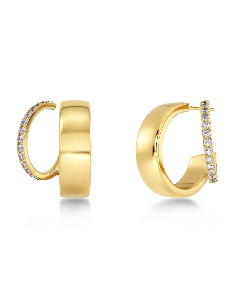 Plié keskittyy korviin, ja sarjan sirot mutta ilmeikkäät ja jännittävät muodot ovat saaneet inspiraationsa klassisesta balettiasennosta. Näissä 14 karaatin kullalla kullatuissa, jännittävissä kaksiosaisissa korvarenkaissa on kaksi kaunista runkoa. Ohuempi rengas on peitetty kimaltavilla kivillä ja leveämpi rengas on sileä, ja yhdessä käytettyinä ne näyttävät kahdelta korvakorulta. Yhdistä muiden suosikkikorvakorujen kanssa luodaksesi oman, ainutlaatuisen tyylin.