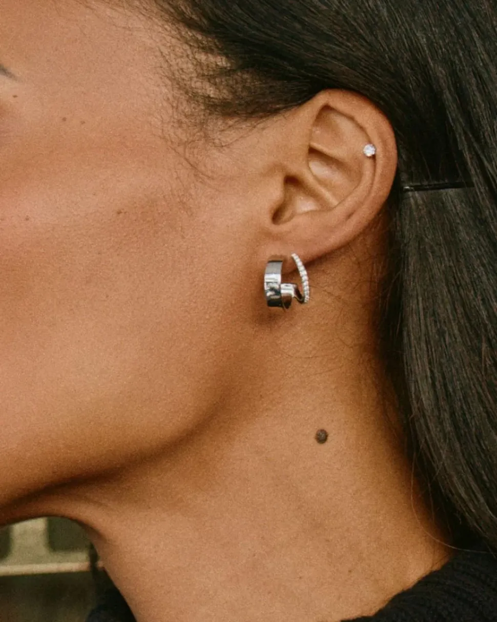 Plié keskittyy korviin, ja sarjan sirot mutta ilmeikkäät ja jännittävät muodot ovat saaneet inspiraationsa klassisesta balettiasennosta. Näissä kiiltävästä ruostumattomasta teräksestä valmistetuissa jännittävissä kaksiosaisissa korvarenkaissa on kaksi kaunista runkoa. Ohuempi rengas on peitetty kimaltavilla kivillä ja leveämpi rengas on sileä, ja yhdessä käytettyinä ne näyttävät kahdelta korvakorulta. Yhdistä muiden suosikkikorvakorujen kanssa luodaksesi oman, ainutlaatuisen tyylin.