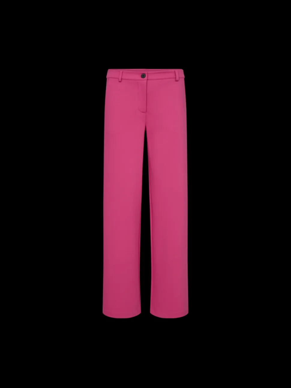 Naisten leveälahkeiset jerseyhousut. Housuissa on kiinnityksenä vetoketju ja nappi .