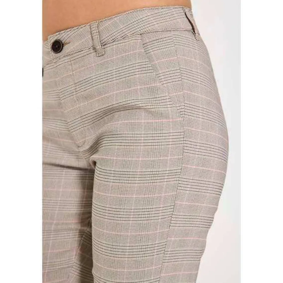 Freequentin housut pehmeästä ja joustavasta materiaalista, jossa ruudullinen printti. Housuissa on yksinkertainen siluetti vetoketjulla ja nappikiinnitys, vinot sivutaskut, kapea istuvuus ja halkio nilkkapituisissa housujen lahkeissa.