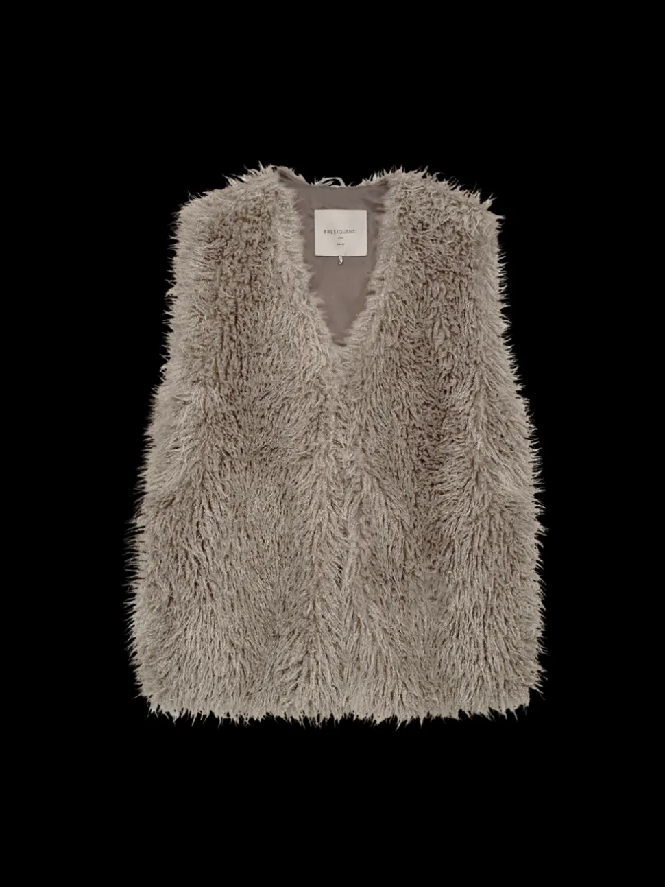 Freequent-liivi pehmeästä hapsukankaasta, jossa on vuori. Liivissä on yksinkertainen siluetti, syvä V-pääntie, piilotettu hakaskiinnitys edessä ja normaali istuvuus.