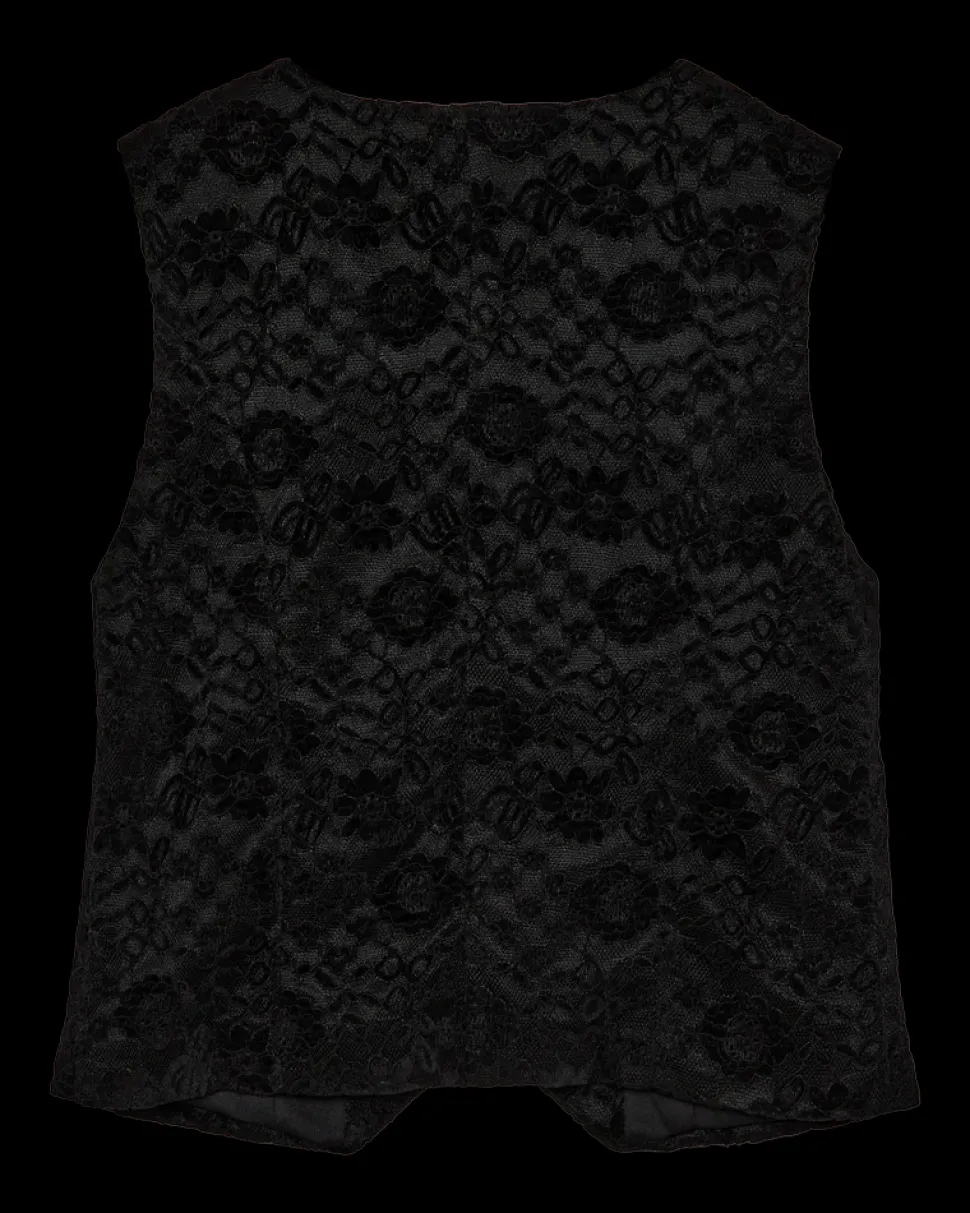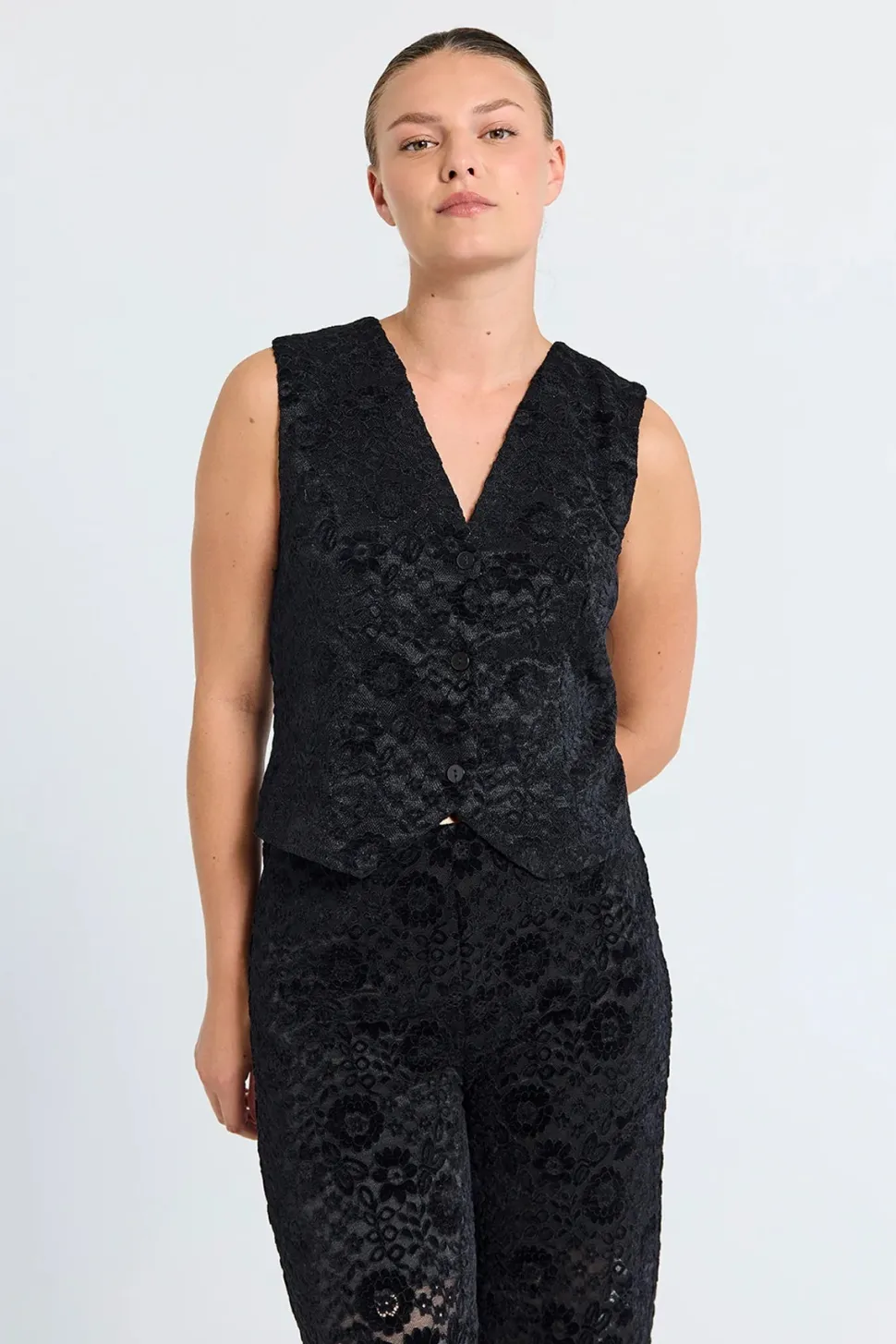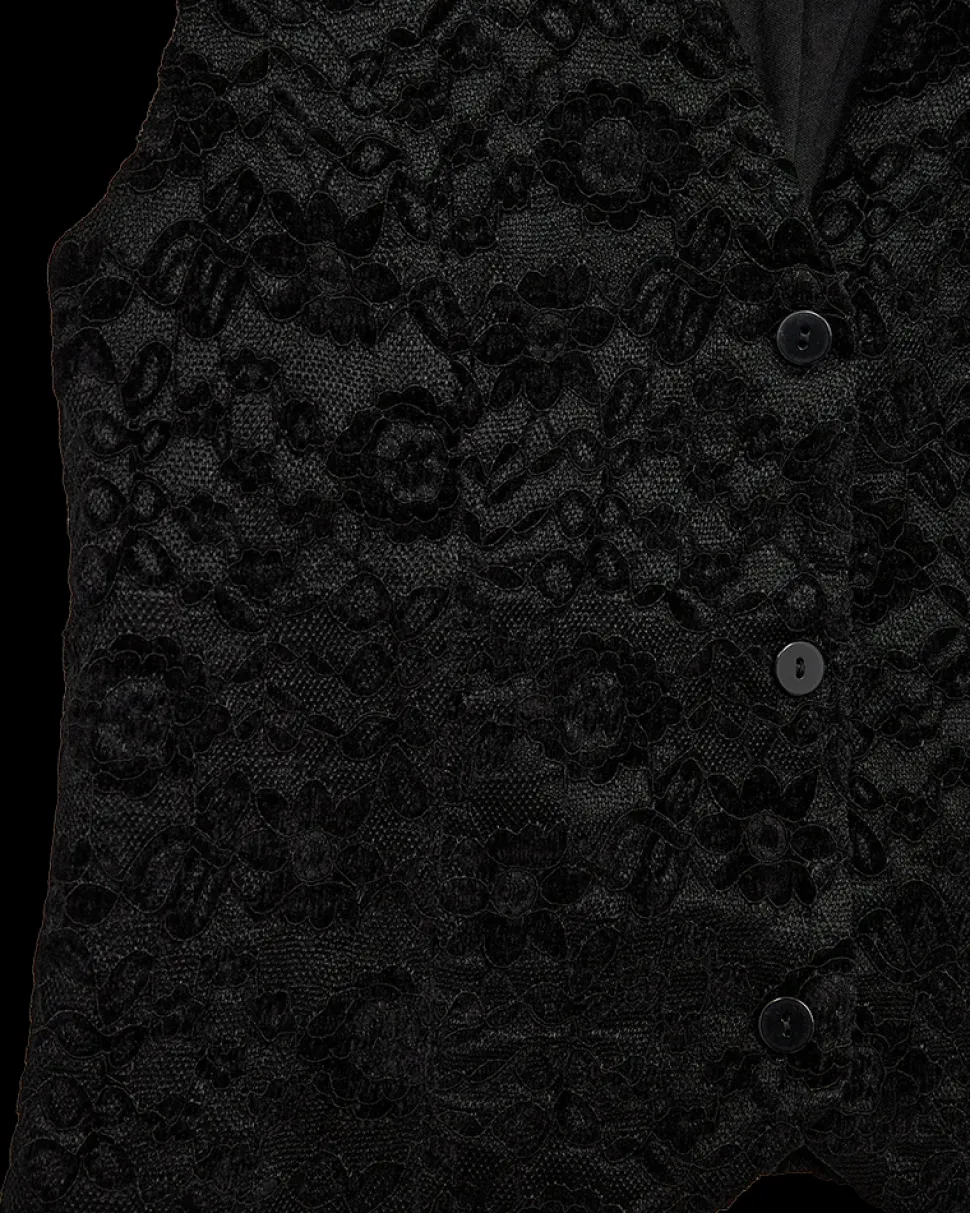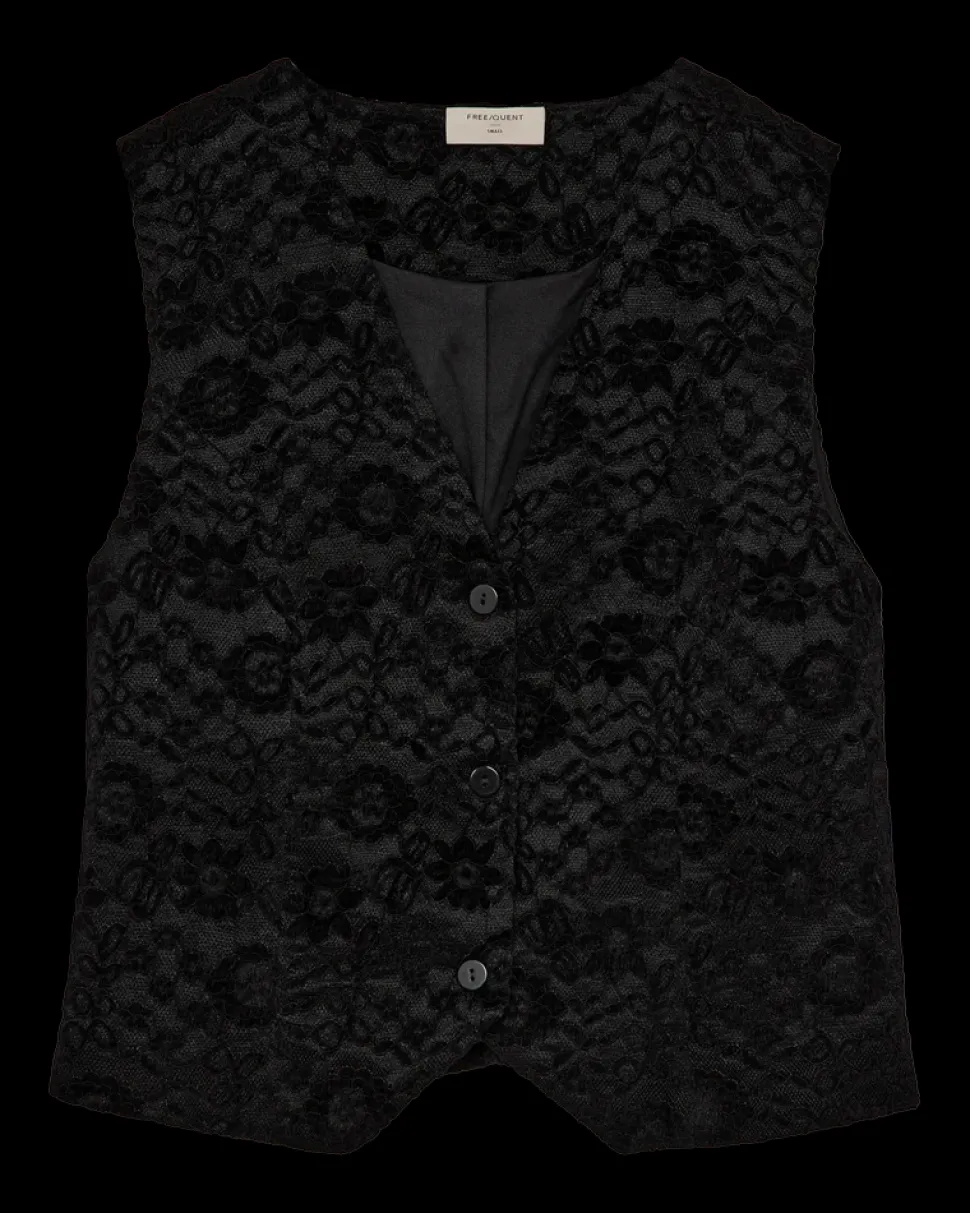 Freequent-liivi kauniista samettisesta pitsimateriaalista, jossa on kukkakuvio. Liivissä on yksinkertainen siluetti, nappikiinnitys, V-pääntie, kapea istuvuus ja täysvuori.