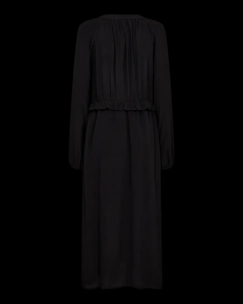 Pitkä Freequentin mekko kevyestä materiaalista kauniilla röyhelöyksityiskohdilla. Joustavat hihat ja vyötärö, sekä v-pääntie. Sivutaskut ja rento istuvuus.