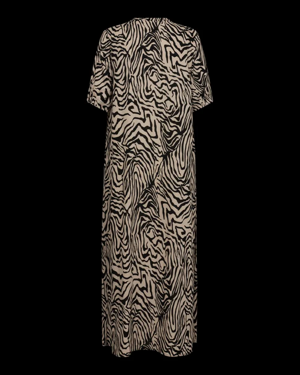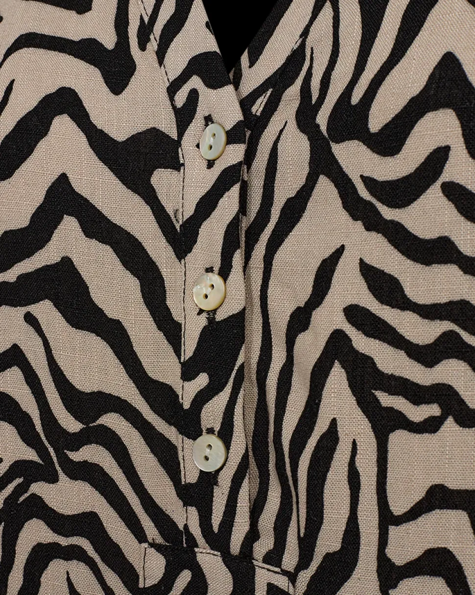 Tämä kevyt ja ilmava mekko on valmistettu pehmeästä viskoosin ja pellavan sekoitteesta, joka tarjoaa miellyttävän tunteen iholla. Mekossa on ajaton eläinkuosinen printti, joka tuo asuun persoonallisuutta. V-pääntie ja nappikiinnitys edessä luovat klassisen ilmeen, kun taas lyhyet hihat ja joustava selkäosa takaavat mukavan istuvuuden. Edessä olevat laskokset korostavat leveää helmaa, joka laskeutuu kauniisti.