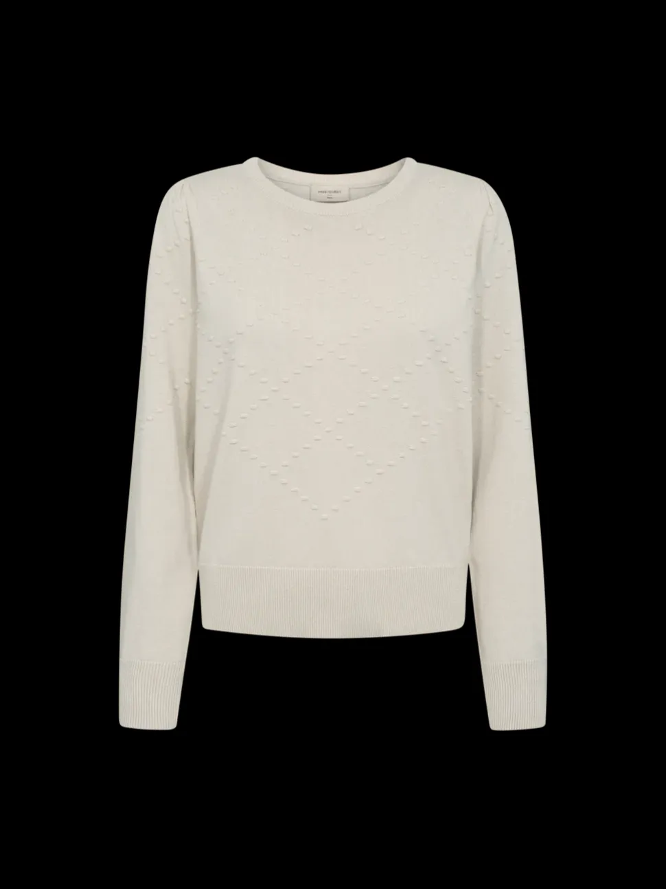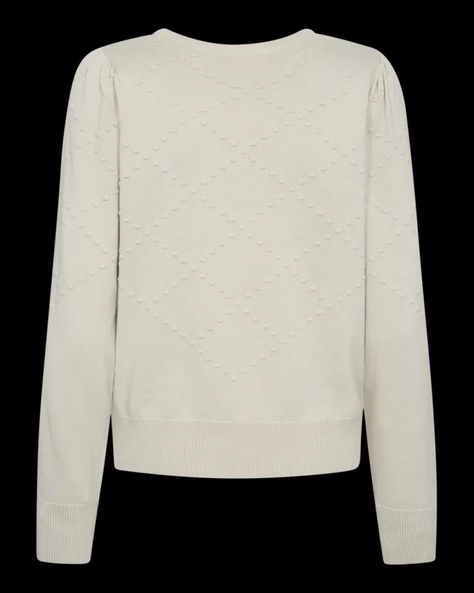 Freequentin neulepusero hienoneulosta materiaalia, jossa on kolmiulotteinen pilkullinen kuvio. Lisäksi neulepuserossa on yksinkertainen siluetti, pitkät hihat, pyöreä pääntie, resori ja elegantti, väljä istuvuus.