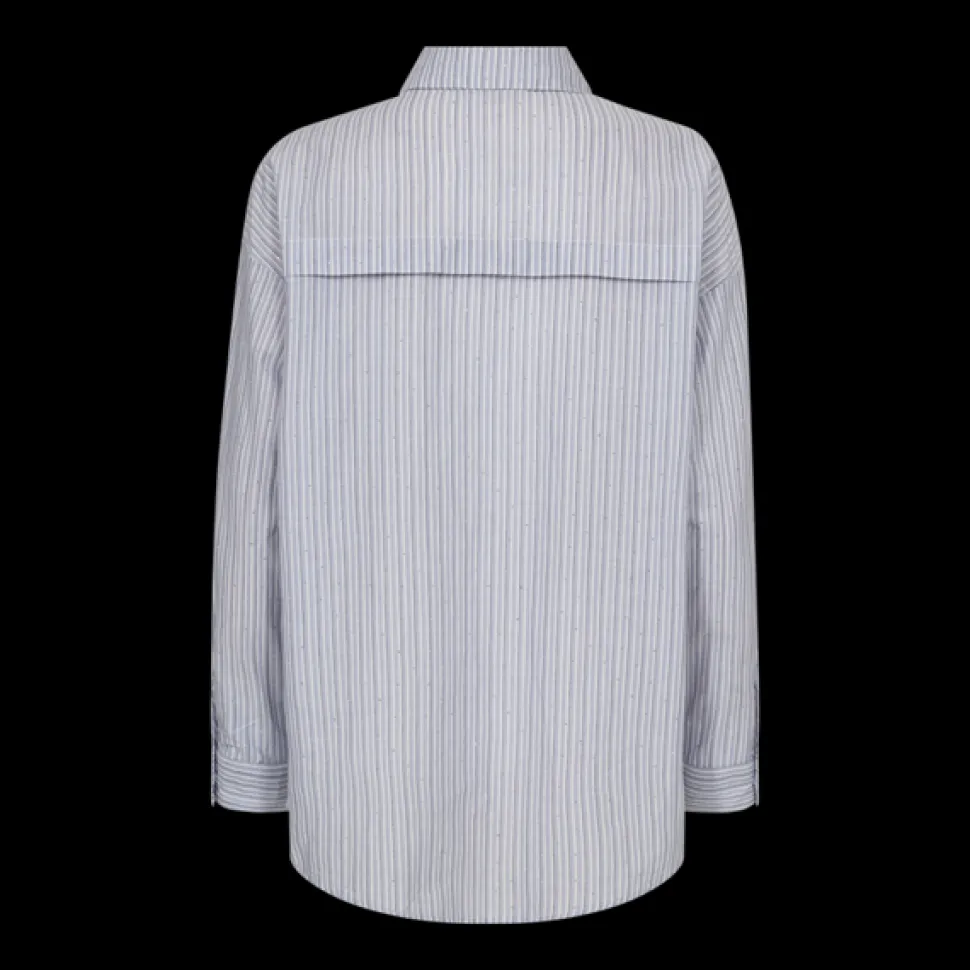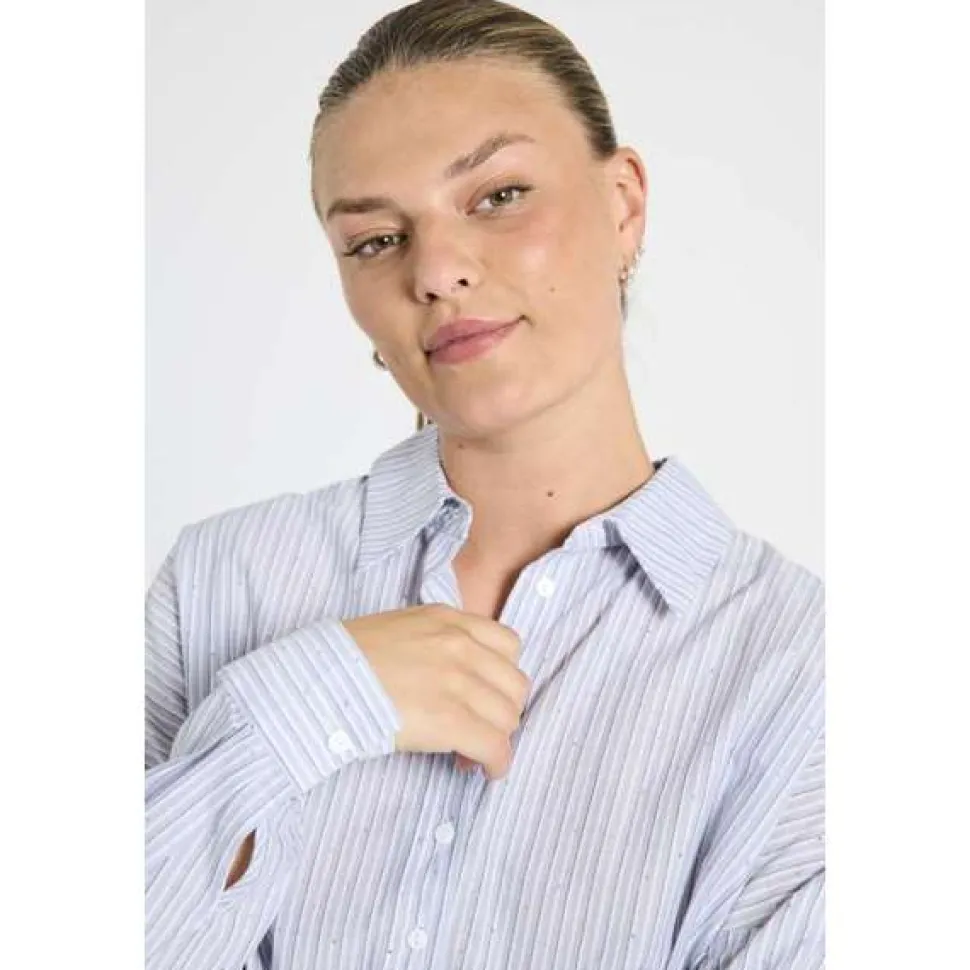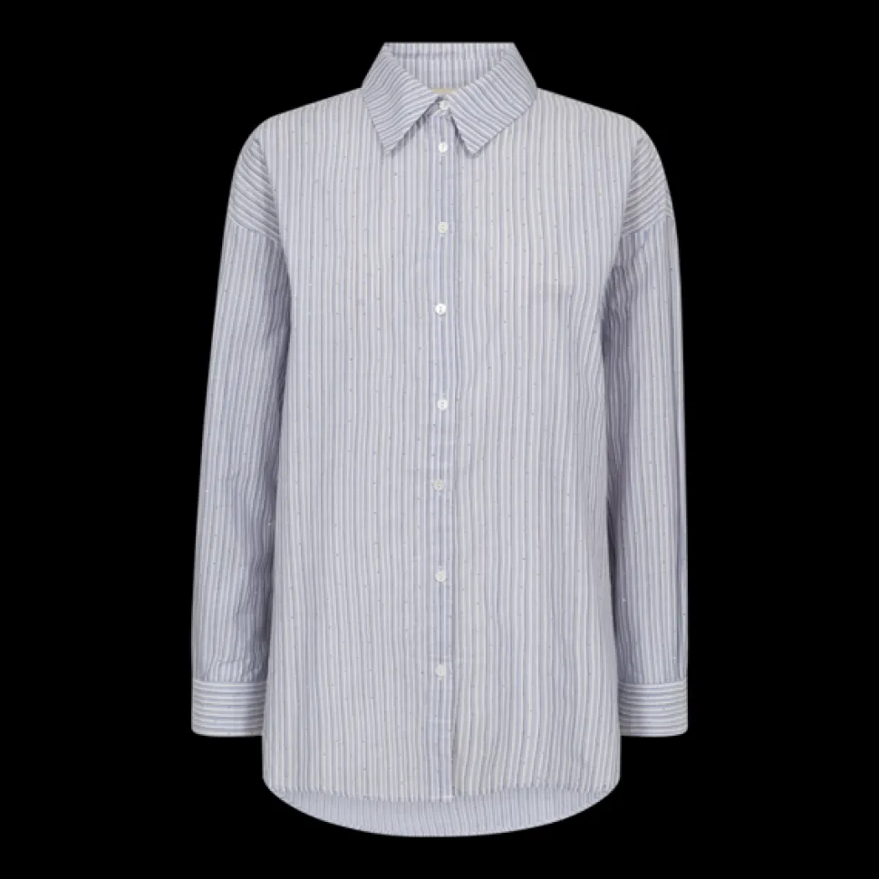 Freequent-paita pehmeästä, raidallisesta materiaalista, koristeltuna pienillä strasseilla. Lisäksi paidassa on yksinkertainen siluetti, jossa on edessä napitus sekä pitkät hihat, joissa on lasketut olkapäät, jotka korostavat rentoa istuvuutta.
