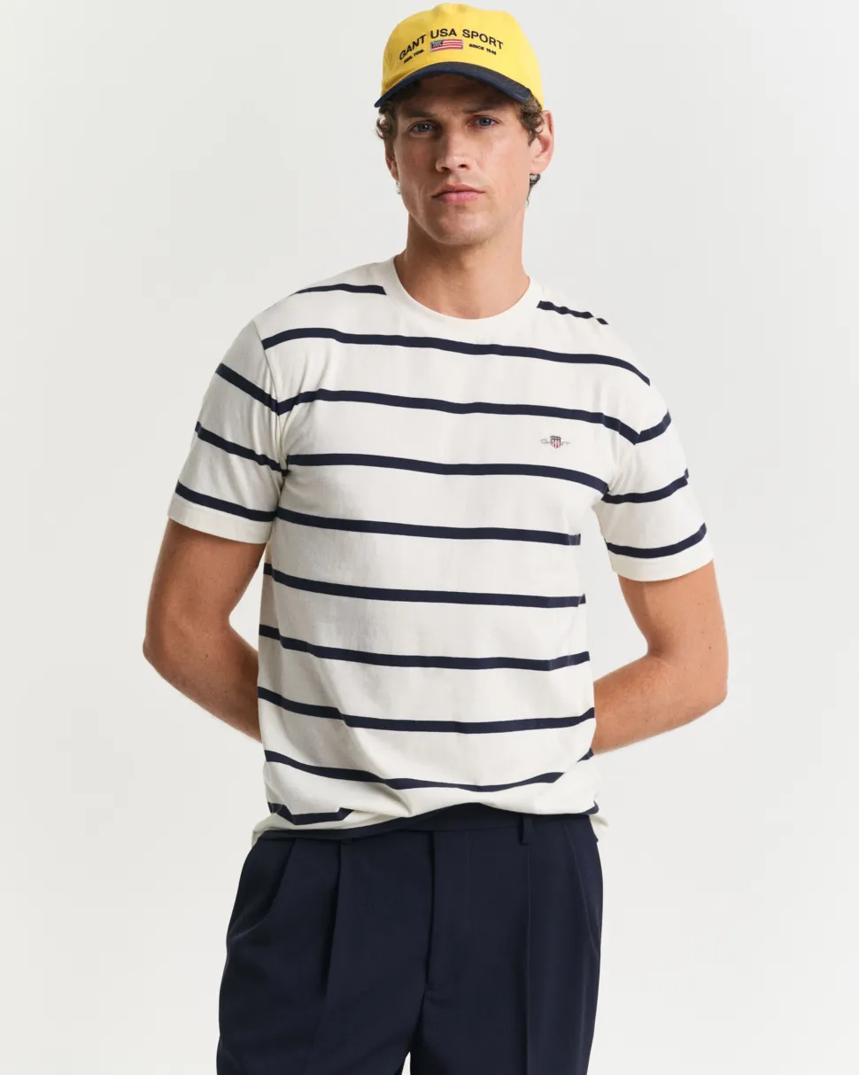 GANTin raidallinen t-paita on tyylikäs ja monikäyttöinen lisä miesten vaatekaappiin. Valmistettu 100 % luomupuuvillasta, tämä paita tarjoaa pehmeän ja miellyttävän tunteen iholla. Sen regular fit -mitoitus, pyöreä pääntie ja lyhyet hihat tekevät siitä täydellisen valinnan niin arkeen kuin vapaa-aikaankin. Rinnassa oleva pieni GANT-kirjailu lisää paitaan hienostuneen yksityiskohdan.