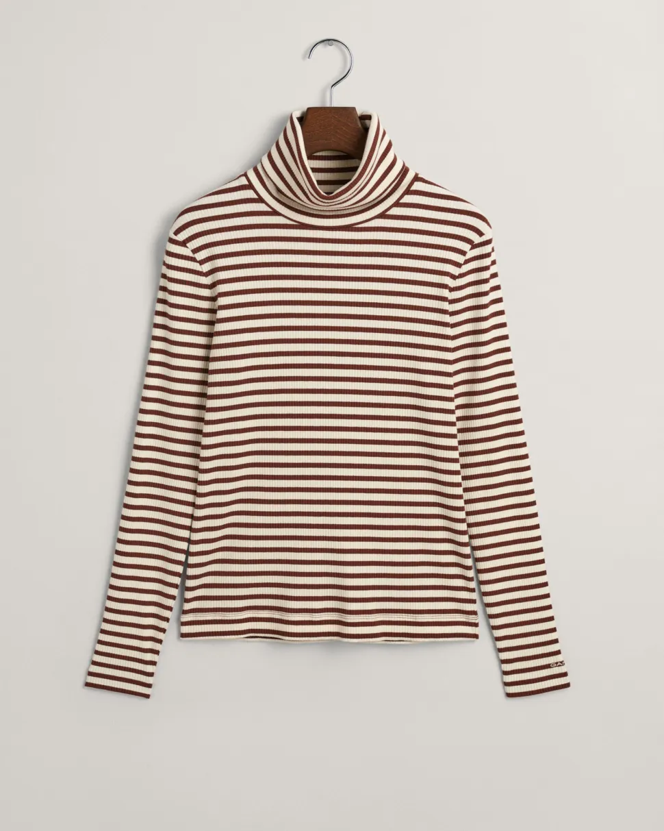 Gantin raidallinen poolopaita. Neule on ribbineulosta. Paidassa on käännetty poolokaulus. Malliltaan paita on vartalonmyötäinen.