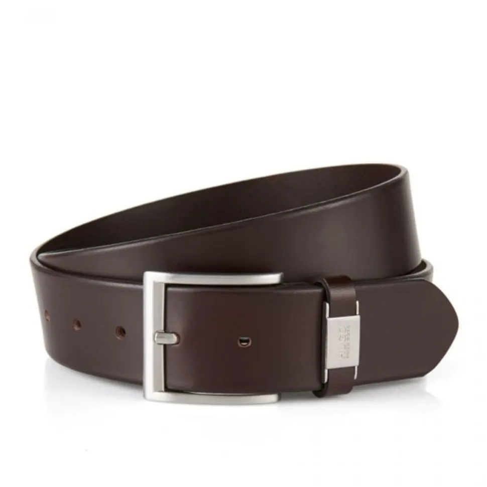 Hugo Boss nahkavyö, leveys 4 senttimetriä. Hopeanvärinen solki, vyönväriset tikkaukset.