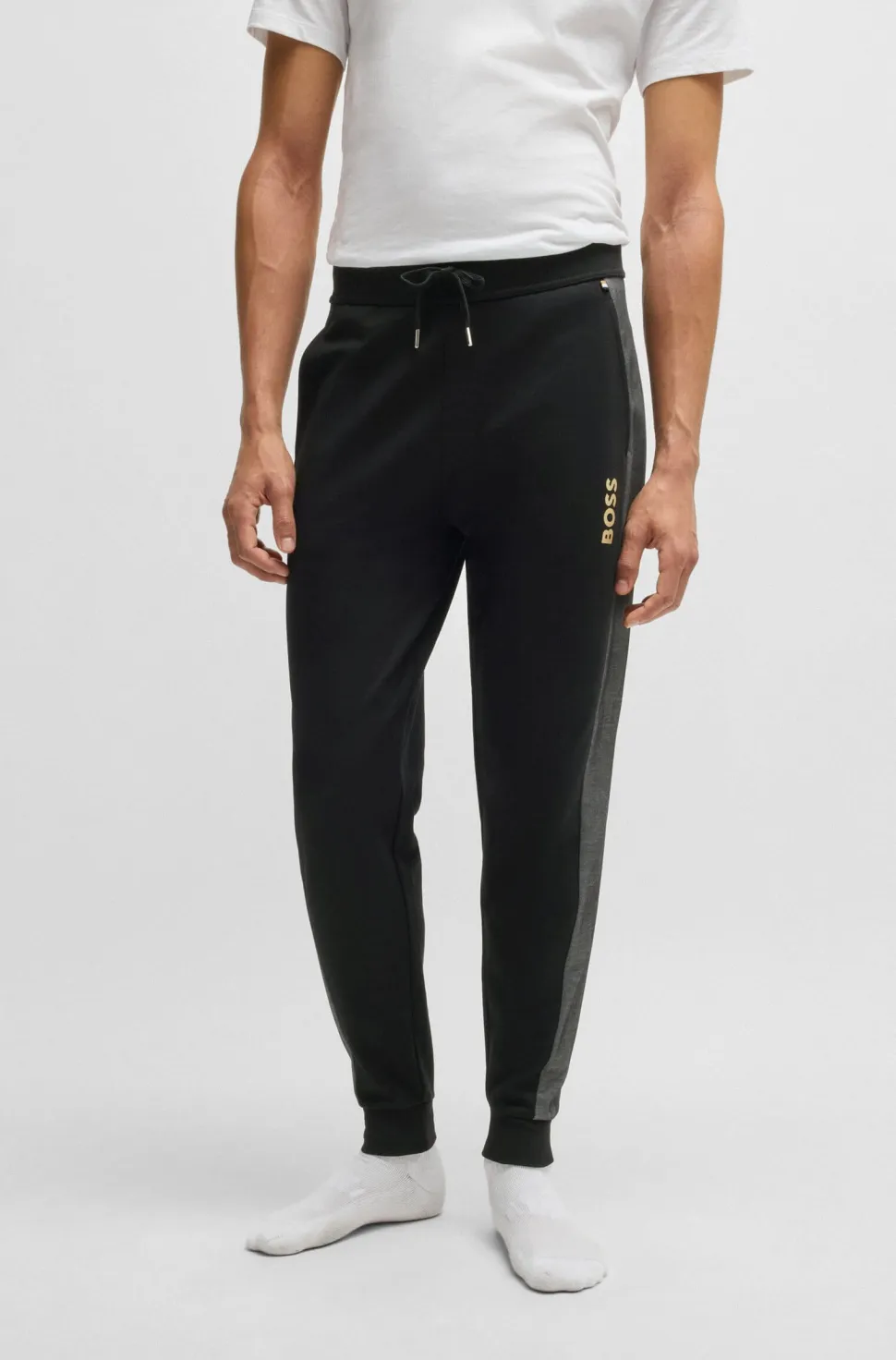 BOSSin verryttelyhousut, joissa on resorit lahkeissa. Valmistettu pehmeästä materiaalista. Sivutaskut ja kiristysnauha.
