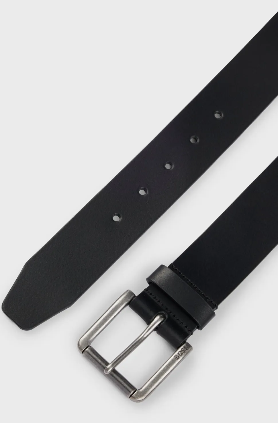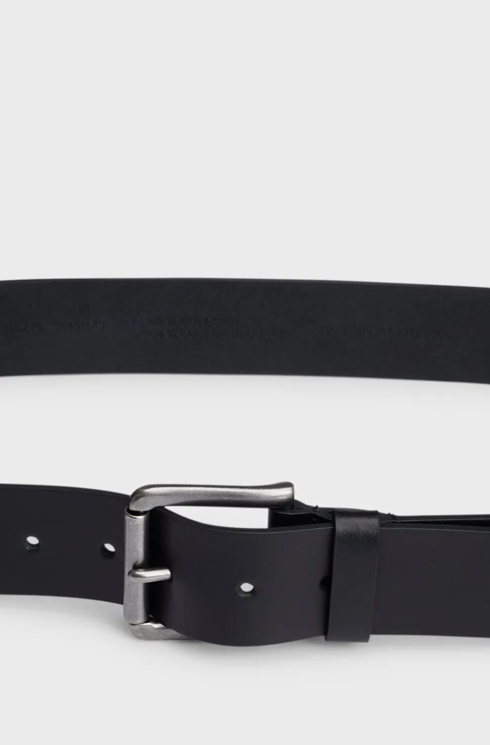 Kaiverrettu logo suljinosassa”>Klassinen 4 cm vyö, joka on suunniteltu sileästä nahasta logokaiverretulla rullasoljella. Osittain vuorattu ja kaiverrettu logo suljinosassa.