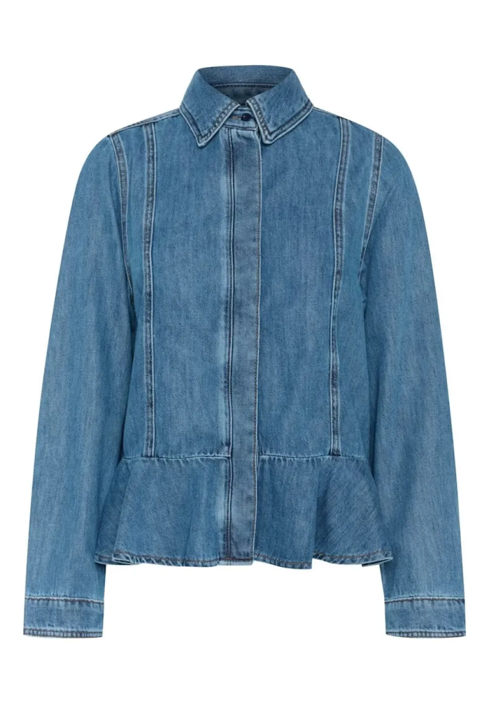 Naisellinen denimpaita, jossa röyhelöyksityiskohta helmassa ja piilotettu nappi. Suunniteltu klassisella kauluksella, pitkät hihat ja näkyvät tikkaukset tyylikkään ilmeen saamiseksi. Valmistettu denimistä. Malli on 176 cm pitkä ja käyttää kokoa 36/S.
