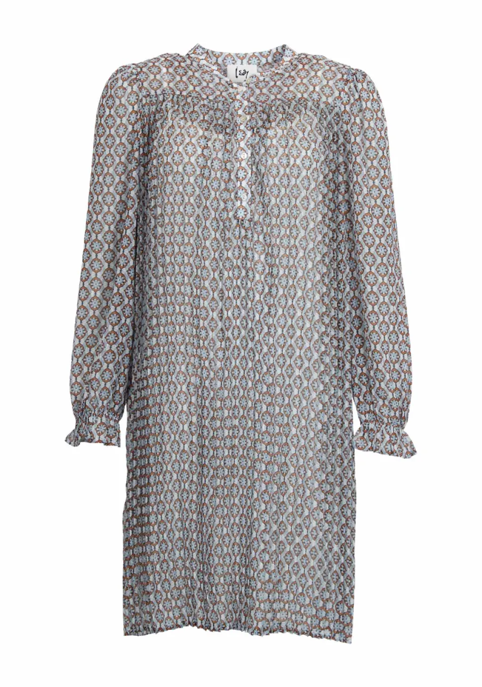 Isayn kauniissa mekossa on väljä istuvuus ja leveät hihat, joissa on smock-hihansuut tässä vaatteessa, yhdistyvät täydellisesti ja luovat upean siluetin. Mekossa on ohut ja läpinäkyvä laskostettu kangas joka laskeutuu käyttäjälleen upeasti. Mekon mukana tulee olkapäiltä irroitettava vaalea alusmekko.