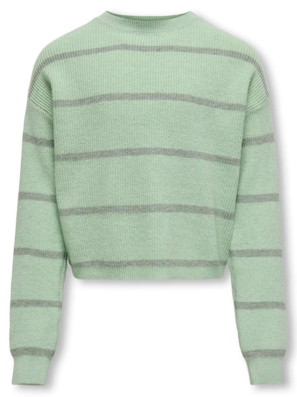 Lasten lyhyt neulepusero, jossa on O-pääntie, pitkät hihat ja resorilliset hihansuut.