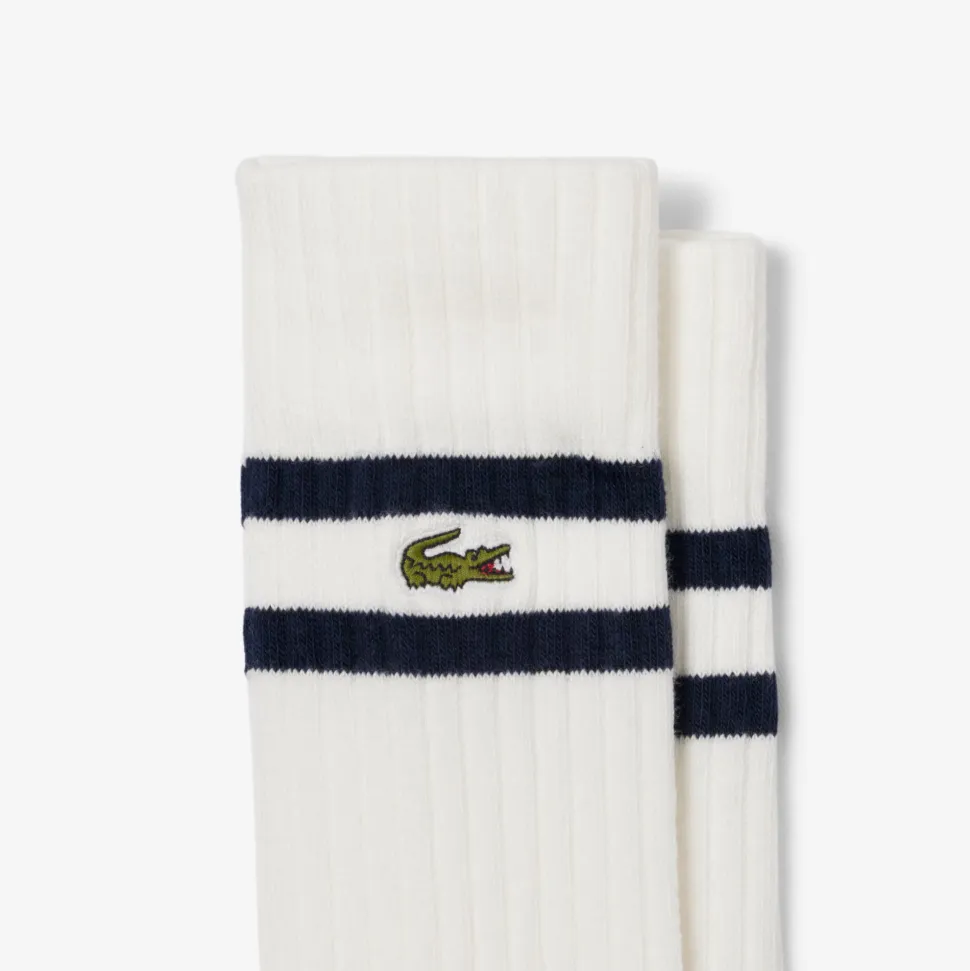 Hillityt ja mukavat Lacoste rib-neulotut sukat tuovat klassista tyyliä jalkinevalikoimaasi. Nämä pitkät sukat on valmistettu pehmeästä puuvillasekoitteesta, joka on hengittävä ja mukava koko päivän käyttöön. Pehmustettu pohja lisää käyttömukavuutta sekä pienellä brodeerattu krokotiililogo ja raidat antavat sukille tyylikkään, ikonisen ilmeen. Rib-neulos takaa hyvän istuvuuden nilkan ympäri ja säilyttää muotonsa myös käytössä, joten sukat toimivat mainiosti arjen ja vapaa-ajan asuihin.