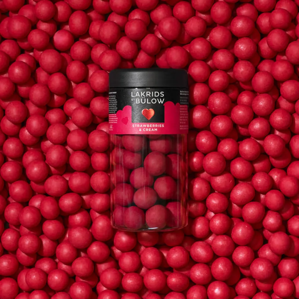 Mansikoita, kerma ja valkoinen suklaa kuorrutettu makea lakritsi: 50% valkoinen suklaa (kaakaota vähintään 26%)(EU)(sokeri, kaakaovoi, täysmaitojauhe, emulgointiaineet (soijalesitiini, lesitiini), luontainen aromi), sokeri, riisijauho, inverttisokerisiirappi, melassi, glukoosisiirappi, kaakaovoi, täysmaitojauhe, 3% mansikoita (EU)(pakastekuivattuja), 1% raakalakritsia (muu kuin EU), rapsiöljy, suola, 0.5% vaniljamaustettu kermajauhe (muu kuin EU)(kerma (suihkukuivataan), luontainen aromi), pintakäsittelyaineet (arabikumi, sellakka), happo: omenahappo, emulgointiaineet (soijalesitiini, lesitiini), luonnolliset aromit, väriaine: karmiinin. Kaakaota vähintään 26%. Gluteeniton. Säilytetään pimeässä, ei liian lämpimässä tilassa.