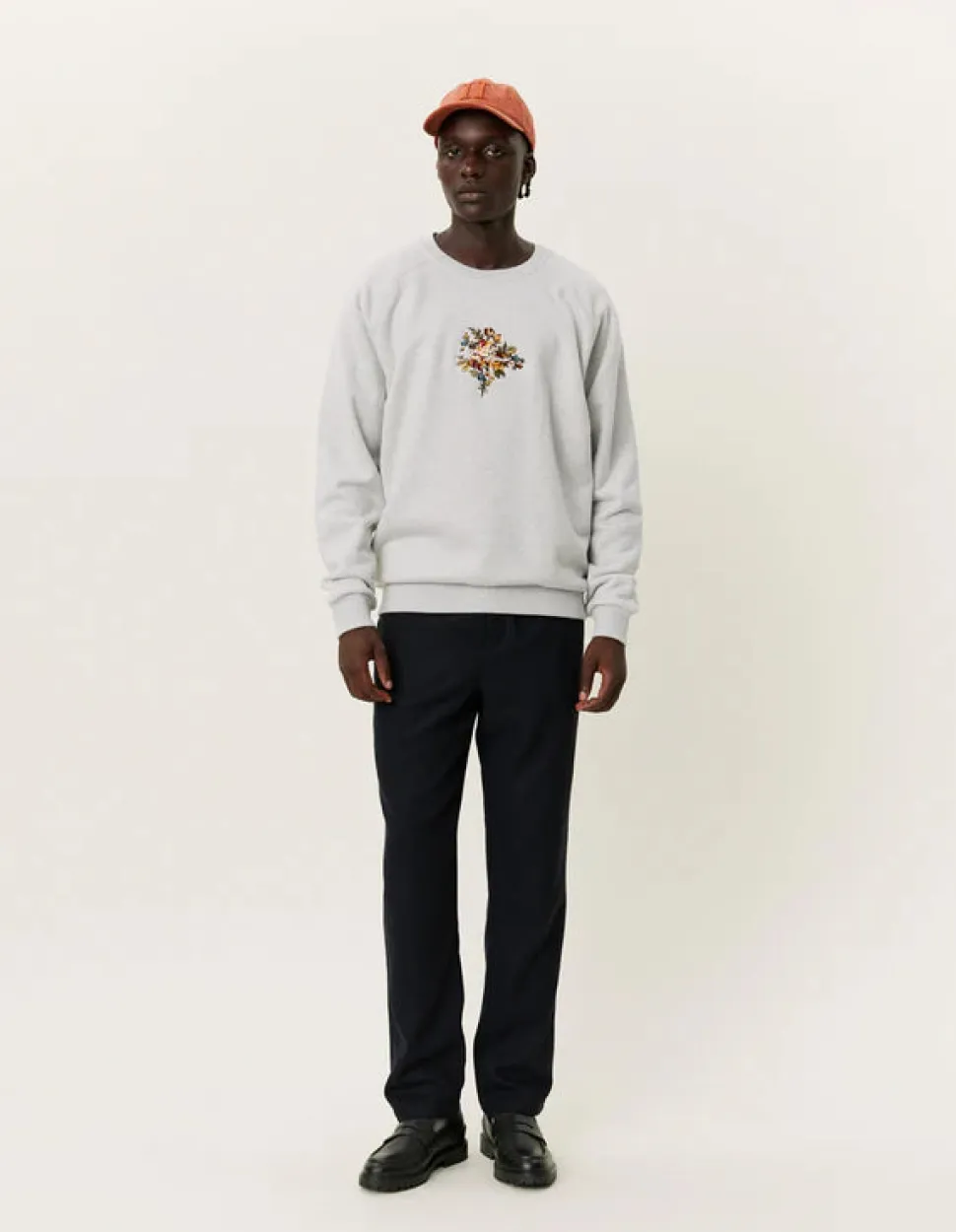 Normaalisti istuva collegepaita erittäin raskaasta 550 GSM:stä, jossa raglanhihat ja brodeerattu kukkakuvioinen tekstitaide rinnassa.