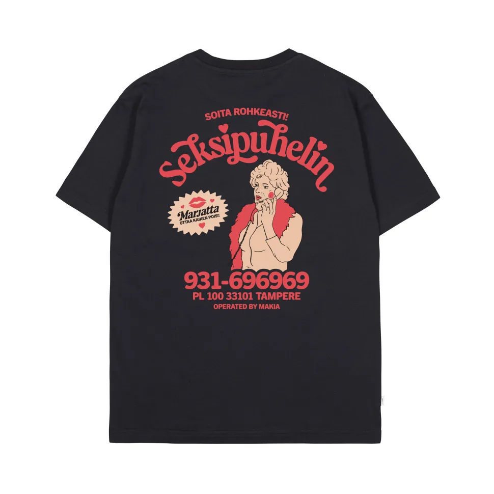Kummeli Forever by Makia -malliston puuvillainen t-paita, jossa näyttävä Seksipuhelin-printti selässä sekä printti edessä rinnassa. Paidassa pyöreä pääntie ja lyhyet hihat.