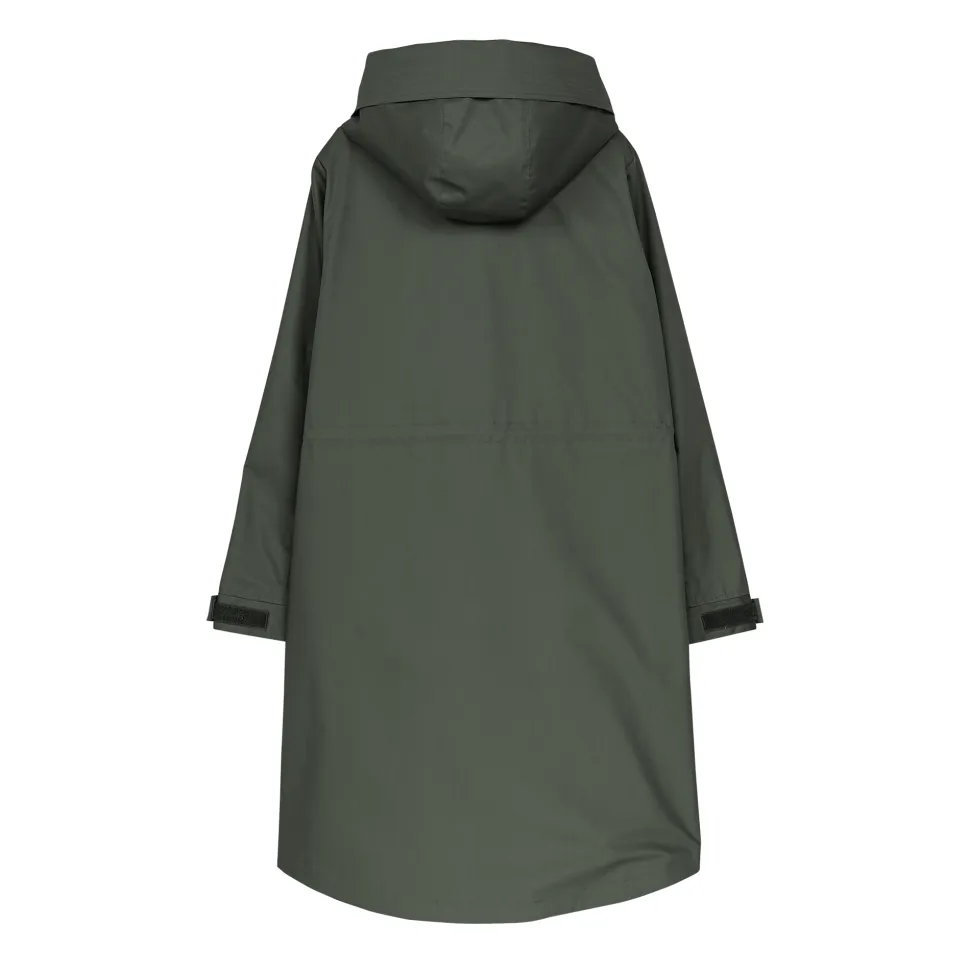 Makian takki on vettähylkivä ja tuulenpitävä. Takissa on huppu ja vyötäröllä kiristys mahdollisuus nauhoilla. Istuvuus on takissa reilu. Kiinnitys on vetoketjulla, joka aukeaa molempiin suuntiin. Hihojen reunassa on kiristys mahdollisuus. Helma on takaa hieman pidempi.