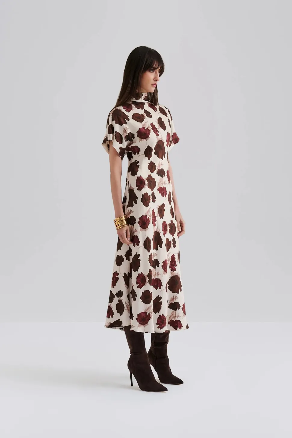 Vastaa kokoaan. Malli käyttää kokoa S ja on 176 cm pitkä.”>Kuvankaunis lyhythihainen satiinimekko, jossa laskostettu poolopkaulus. Malli käyttää kokoa S ja on 176 cm pitkä.
