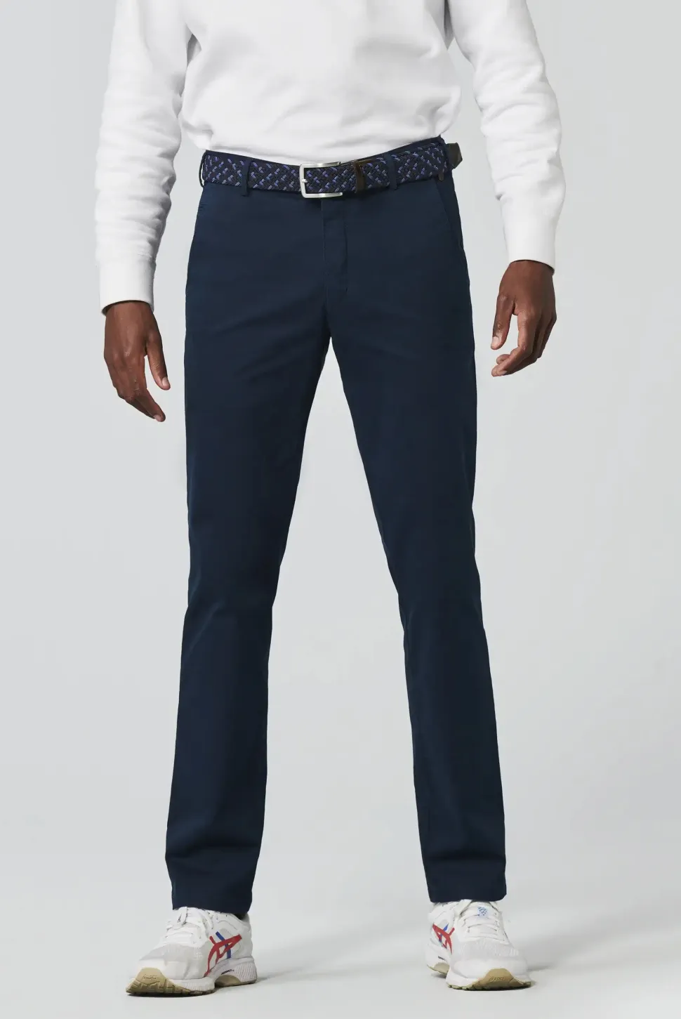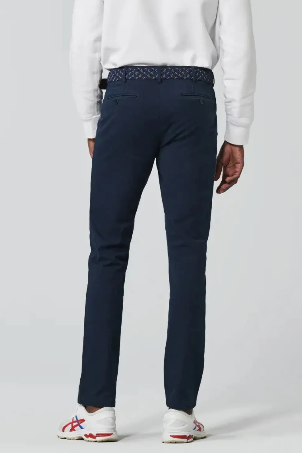 Chinos pyöristetyillä sivutaskuilla ”Modern Fit” ohuella siluetilla Lahkeen alisuun leveys 38 cm koossa 50 Semi-sartoriaalinen muotoilu Ainutlaatuinen vyötärönauha optimaalisen mukavuuden takaamiseksi Paidan stopper vyötärönauhassa Mukavampi ja turvallisempi istuvuus joustavan vyötärönauhan ansiosta
