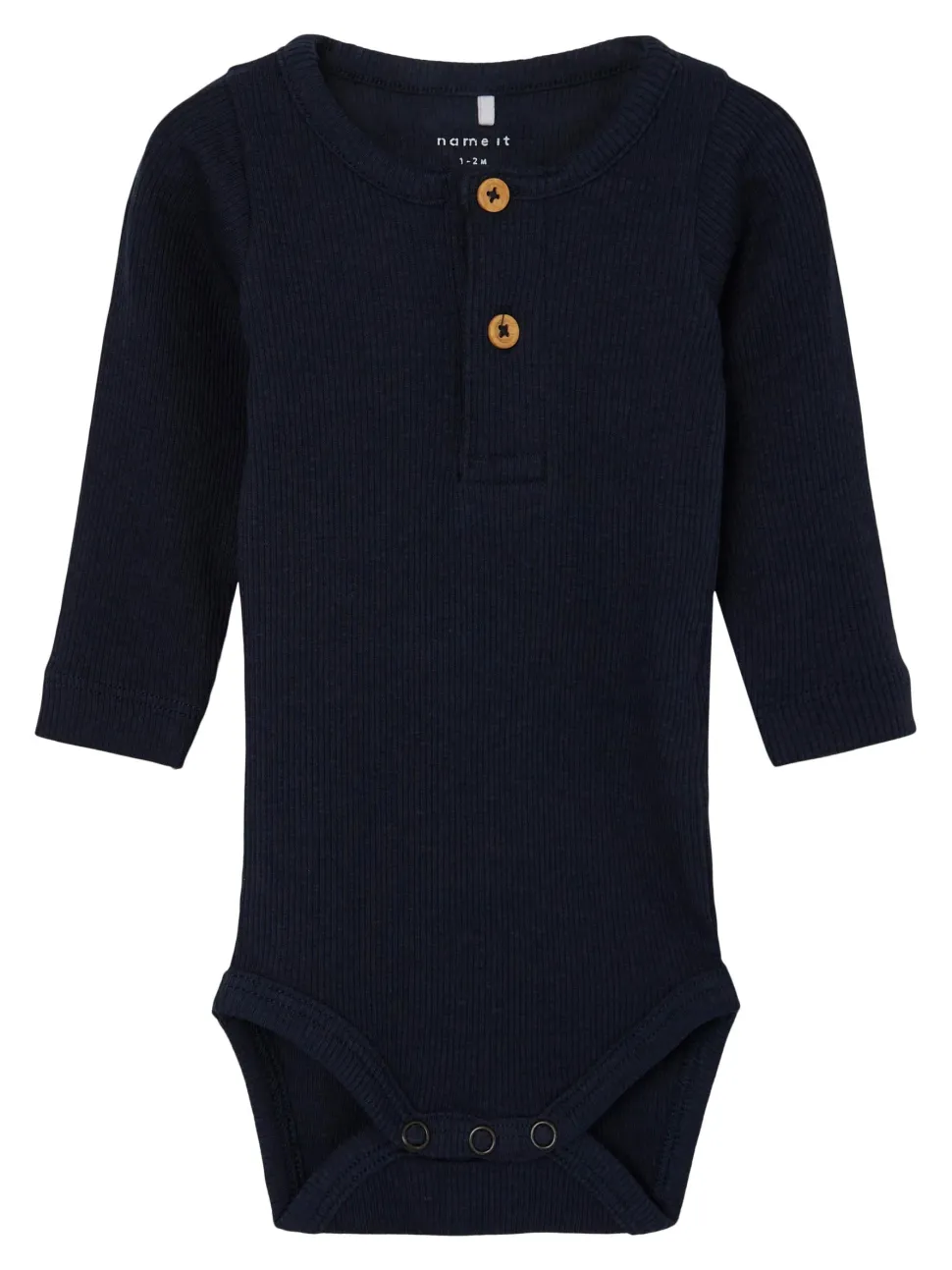 Lasten pitkähihainen body ribbineulosta. Kiinnitys neppareilla haarasta ja edessä pääntiellä nappihalkio.