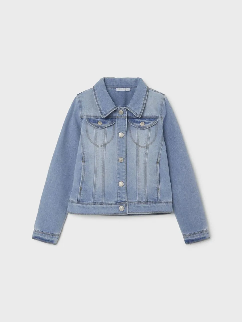 Name It rento takki ohutta ja kulutettua denimiä. Nepparikiinnitys, avotaskut ja läpälliset koristetaskut. Malliltaan hieman muotoonommeltu.