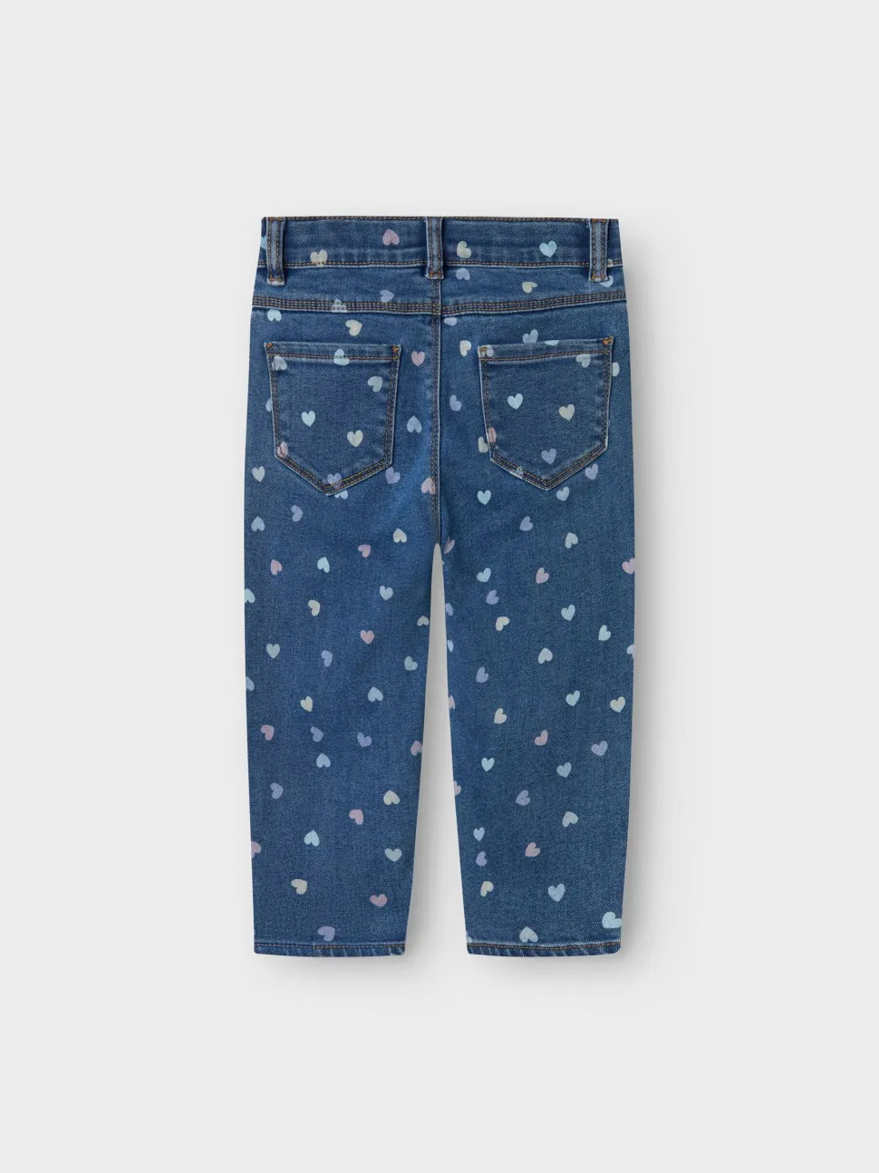 – Tuotetyyppi: mom fit -farkut – Taskut: etutaskut – Taskut: takataskut – Kuosi: tuotteessa kauttaaltaan toistuva kuosi – Pesu: hillitty kulumaefekti – Kiinnitys: painonasta ja lyhyt valesepalus (koot 80–110) tai hakasnappi ja vetoketjukiinnitys (koot 116–164) – Kiinnitys: painonappikiinnitys – Muut yksityiskohdat: säädettävä vyötärö – Muut yksityiskohdat: niitit – Pesu: hillitty kulumaefekti – Malli: näissä farkuissa on baggy fit -istuvuus lantiolla, ja niiden malli on trendikäs mom fit