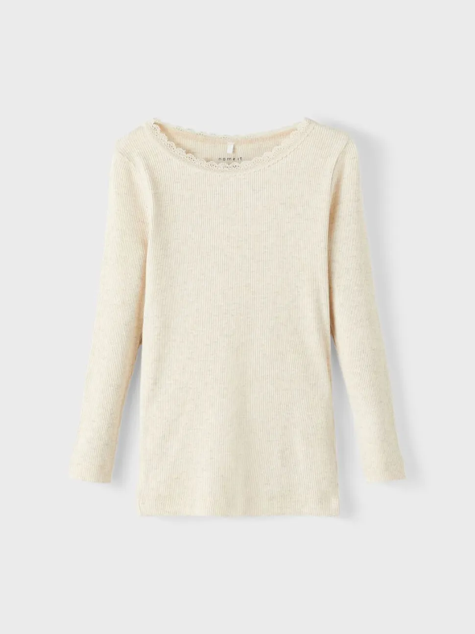 Name It lasten pitkähihainen paita. Paidan pääntiellä kapea pitsi yksityiskohtana.