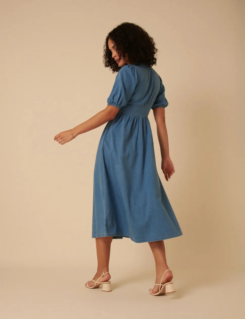 Kevätvalmis versio upeasta Starlight-tyylistä. Olemme ihastuneet pehmeään rypytykseen, puhvihihoihin ja kauniiseen päällystettyjen nappien riviin – mekossa on jopa taskut.
