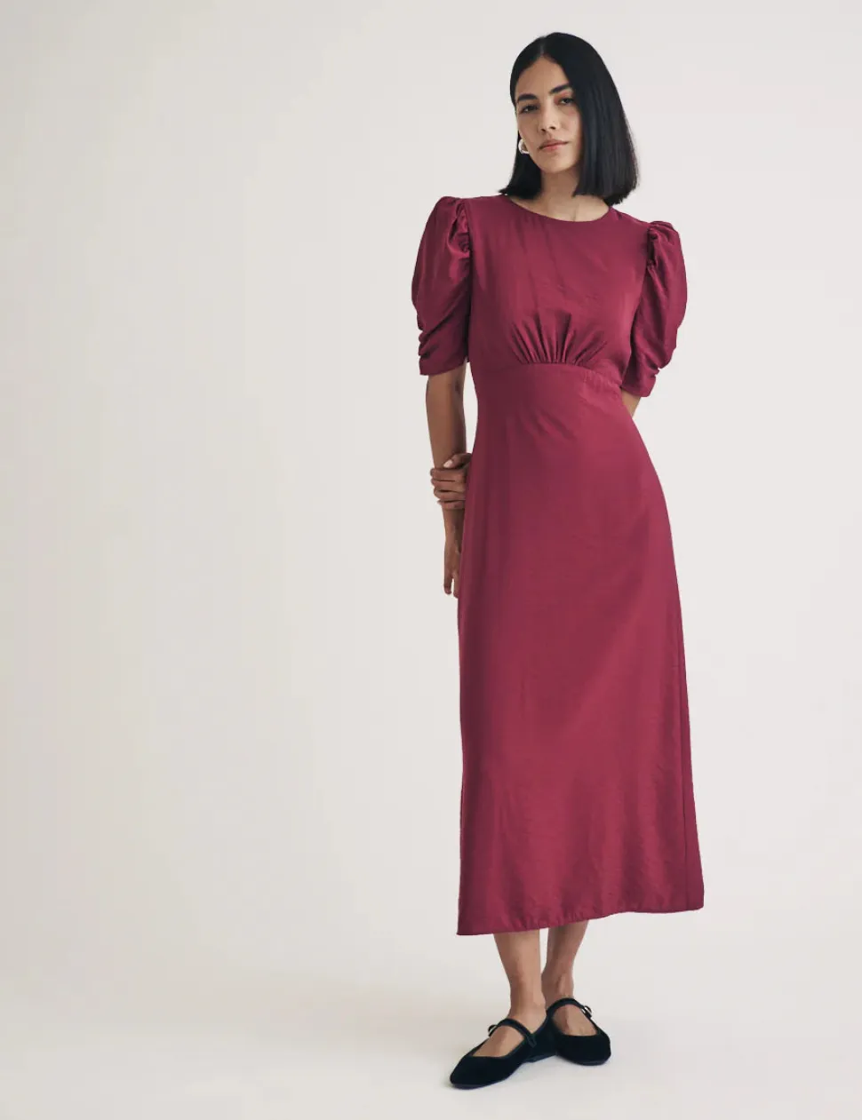 Mekon rypytetyt hihat ja kaareva vyötärösauma lisäävät ilmettä. Mekko on valmistettu vastuullisesta viskoosiseoksesta.