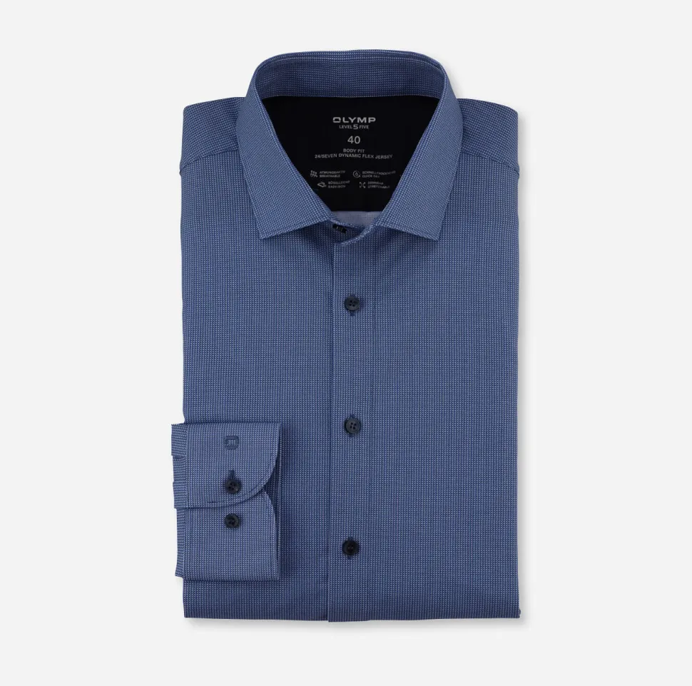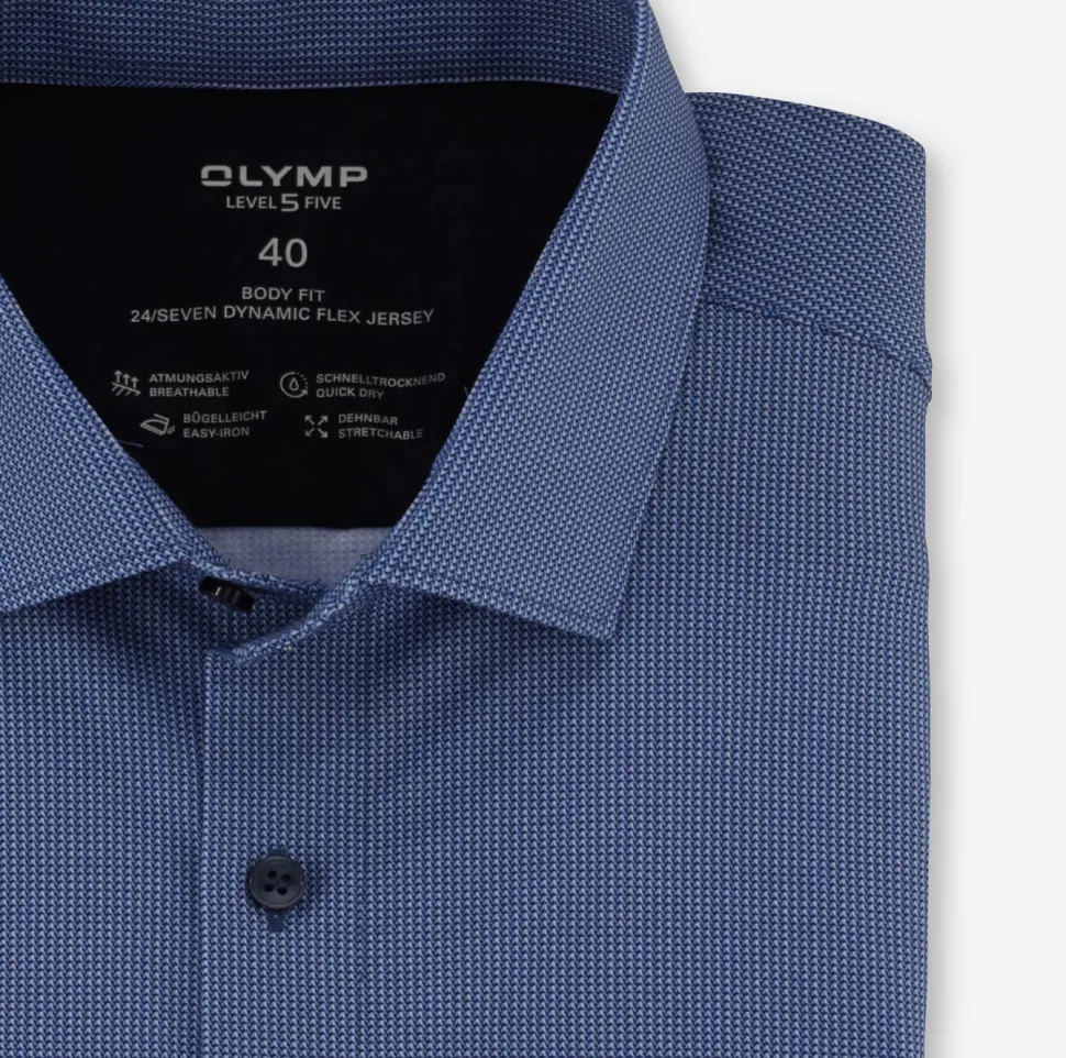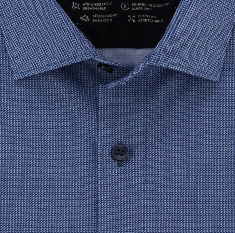Olymp miesten tyylikäs pitkähihainen kauluspaita. Skarpit kaulukset, napitus edessä ja hihoissa sekä vartalonmyötäinen istuvuus. Kevyt materiaali, joka hengittää ja joka kuivuu nopeasti.