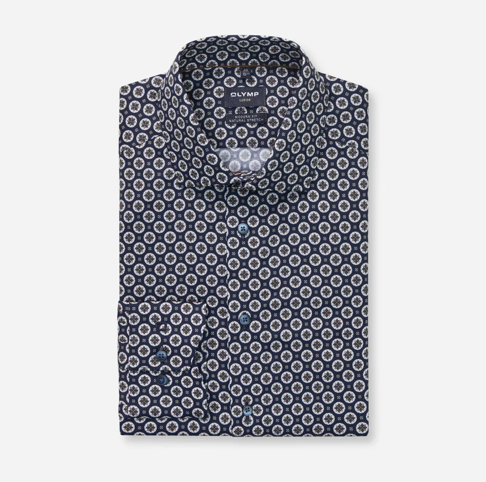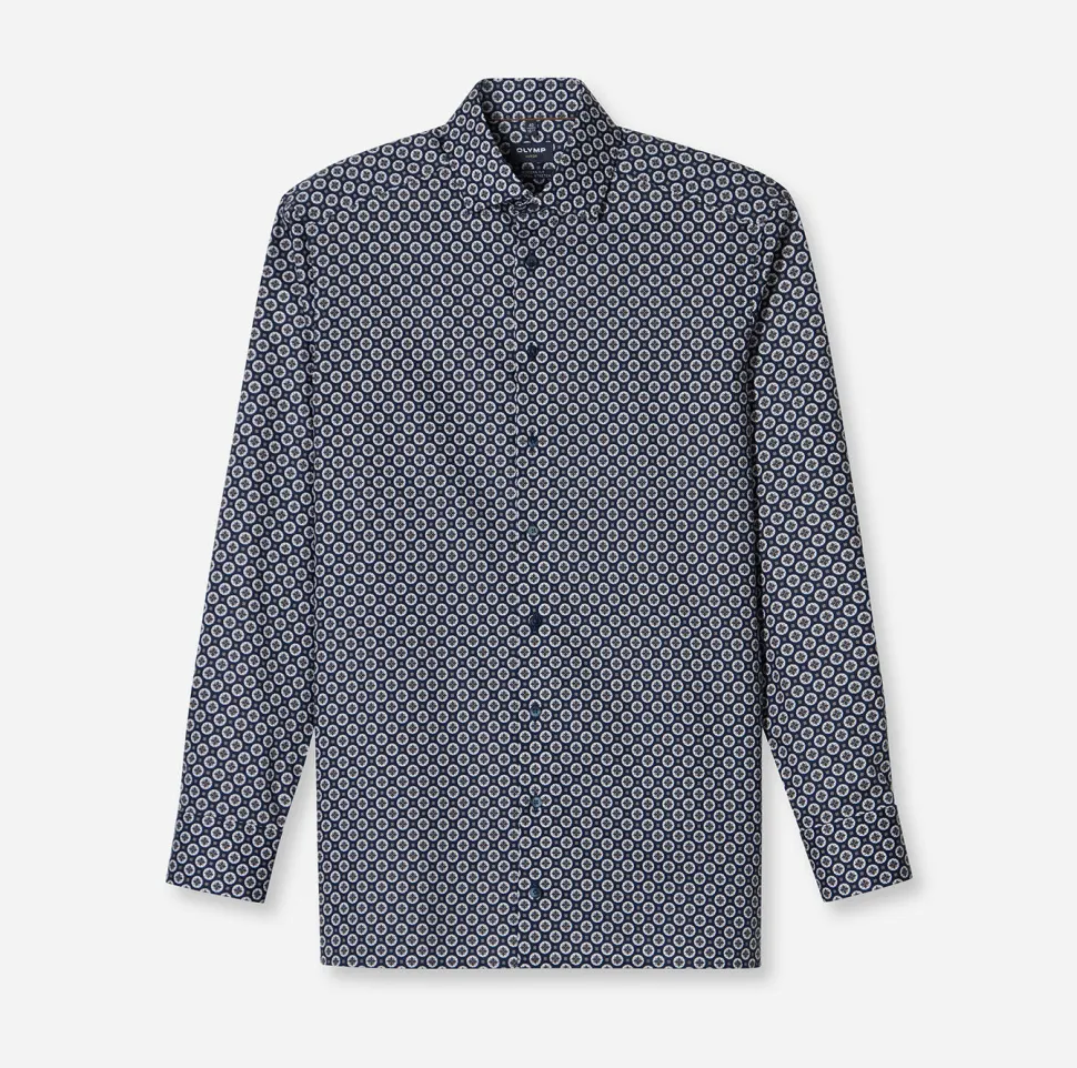 Elegantti miesten Club OLYMP Luxor -paita hienostuneesta tummansinisestä väristä. Hieno 100-prosenttisesta puuvillasta valmistettu kangas vakuuttaa elegantilla kiillollaan, maskuliinisella tyylillään ja vartalonmyötäisellä leikkauksellaan. Hienojen lankojen erityisominaisuuksiin kuuluvat ihoystävällinen mukavuus ja helppohoitoisuus. Viimeistelee kosmopoliittinen Global Kent -kaulus. Ei tarvitse silittää.