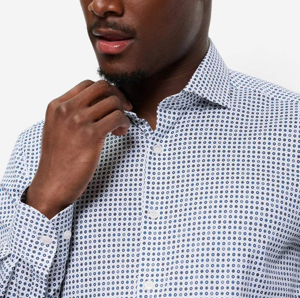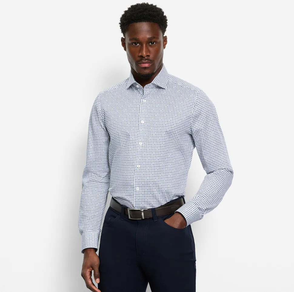 Tämä miellyttävän sileä Level Five Body Fit -business-paita on valmistettu joustavasta Comfort Stretch -materiaalista, se on muotonsa säilyttävä, ihoystävällinen ja erityisen helppohoitoinen. Graafisen minimalistisen muotoilunsa ansiosta se korostaa mitä tahansa muodikasta toimistotyyliä sekä huomaamattomasti että tehokkaasti. Tyylikäs ja rento, maskuliinisella Royal Kent -kauluksella ja pyöristetyllä helmalla.
