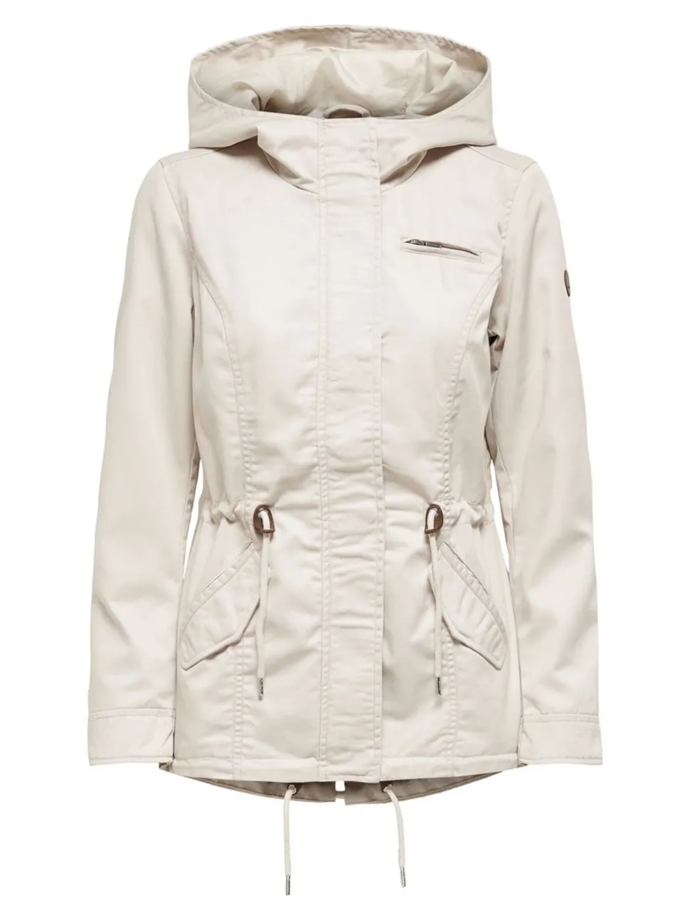Onlyn kevyt parkatakki toimii välikausitakkina niin keväällä kuin syksyllä. Lyhytmallinen kevättakki, jossa on huppu ja hieman korotettu kaulus. Vetoketjukiinnitys ja nappilista, joka sujaa tuulelta. Vetoketjullinen rintatasku ja lpälälliset etutaskut. Vyötäröllä kiristysnauha. Takaa helma pyöristetty.
