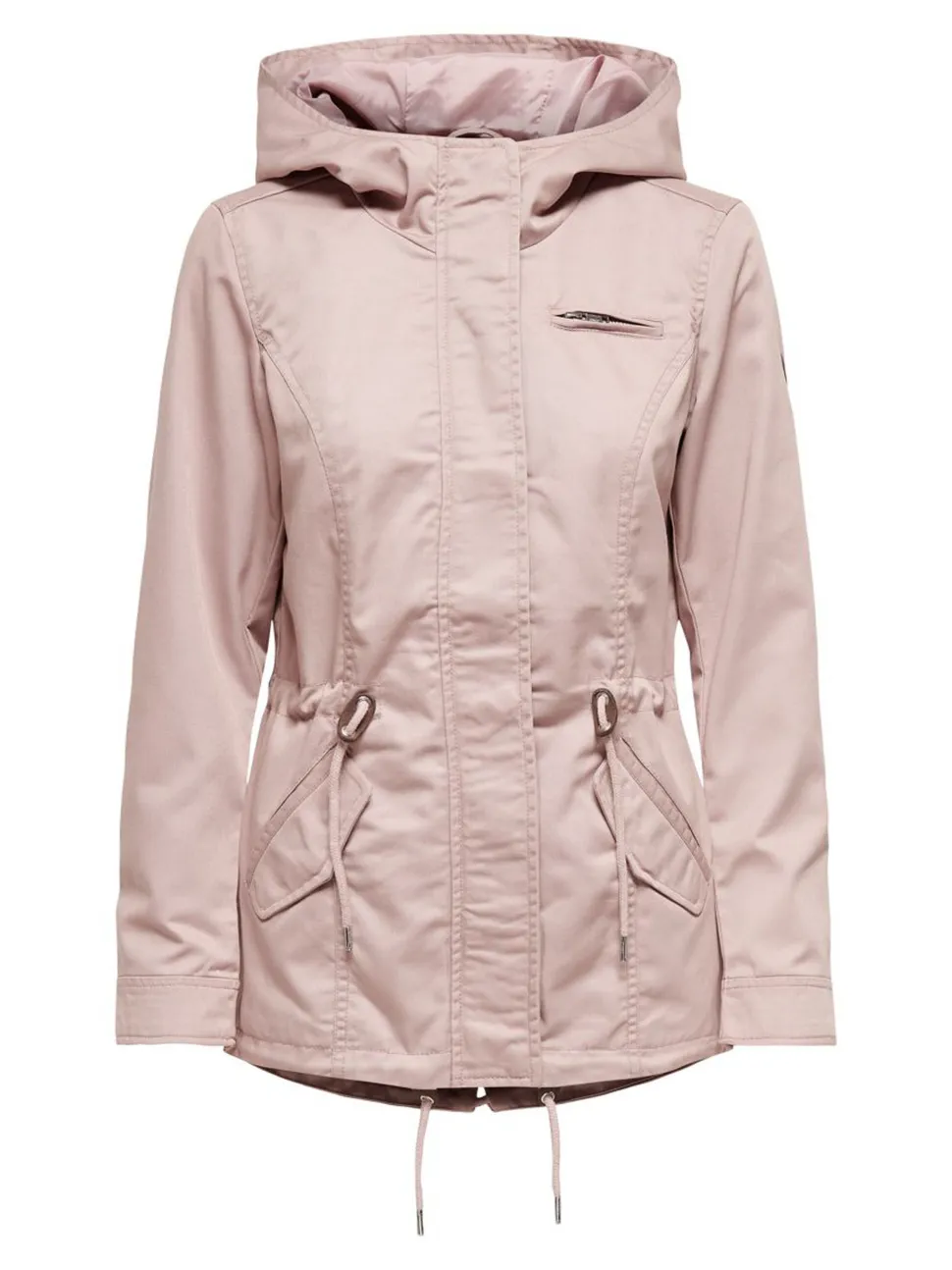 Onlyn kevyt parkatakki toimii välikausitakkina niin keväällä kuin syksyllä. Lyhytmallinen kevättakki, jossa on huppu ja hieman korotettu kaulus. Vetoketjukiinnitys ja nappilista, joka sujaa tuulelta. Vetoketjullinen rintatasku ja lpälälliset etutaskut. Vyötäröllä kiristysnauha. Takaa helma pyöristetty.
