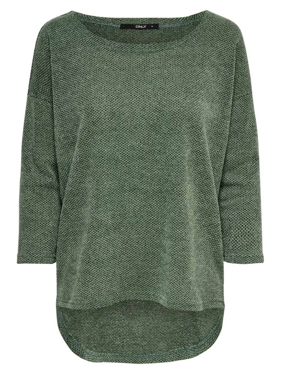 Onlyn rento, laatikkomallinen pusero ohutta neulosta, Avara pääntie, 3/4-hihat. Helma takaa pyöristetty ja pidempi. Koossa S pituus edessä n.63 cm, takana n.73 cm. Valmistusmaa Kiina.