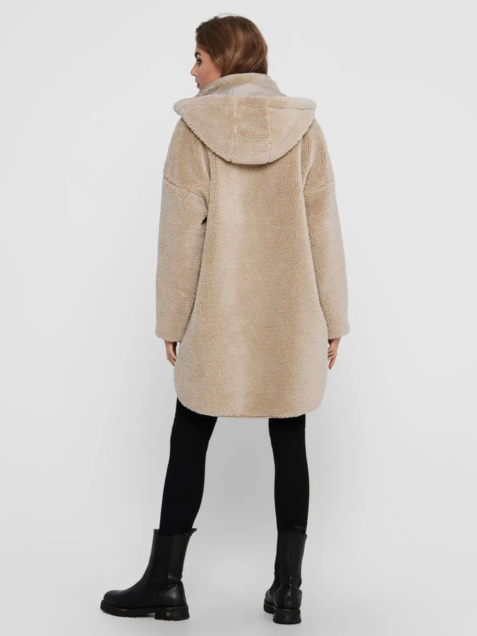 Naisten pehmeä, hupullinen teddytakki, oversize. Pystykaulus, kolme taskua edessä. takki suljetaan vetoketjulla. Sivuilta pyöristetty helma. Takissa on vuori.