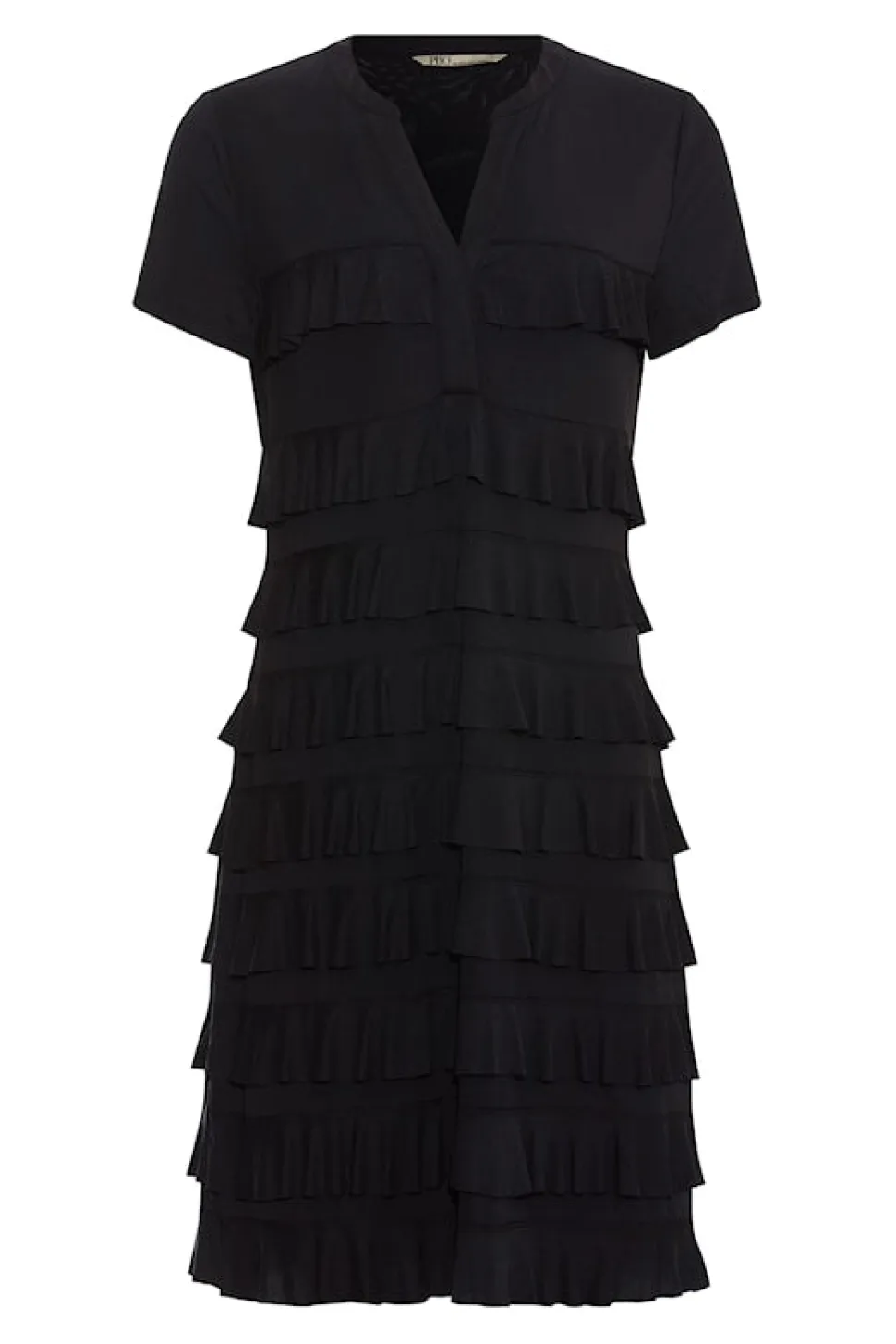Lyhythihainen mekko, jossa v-pääntie ja röyhelöyksityiskohdat.