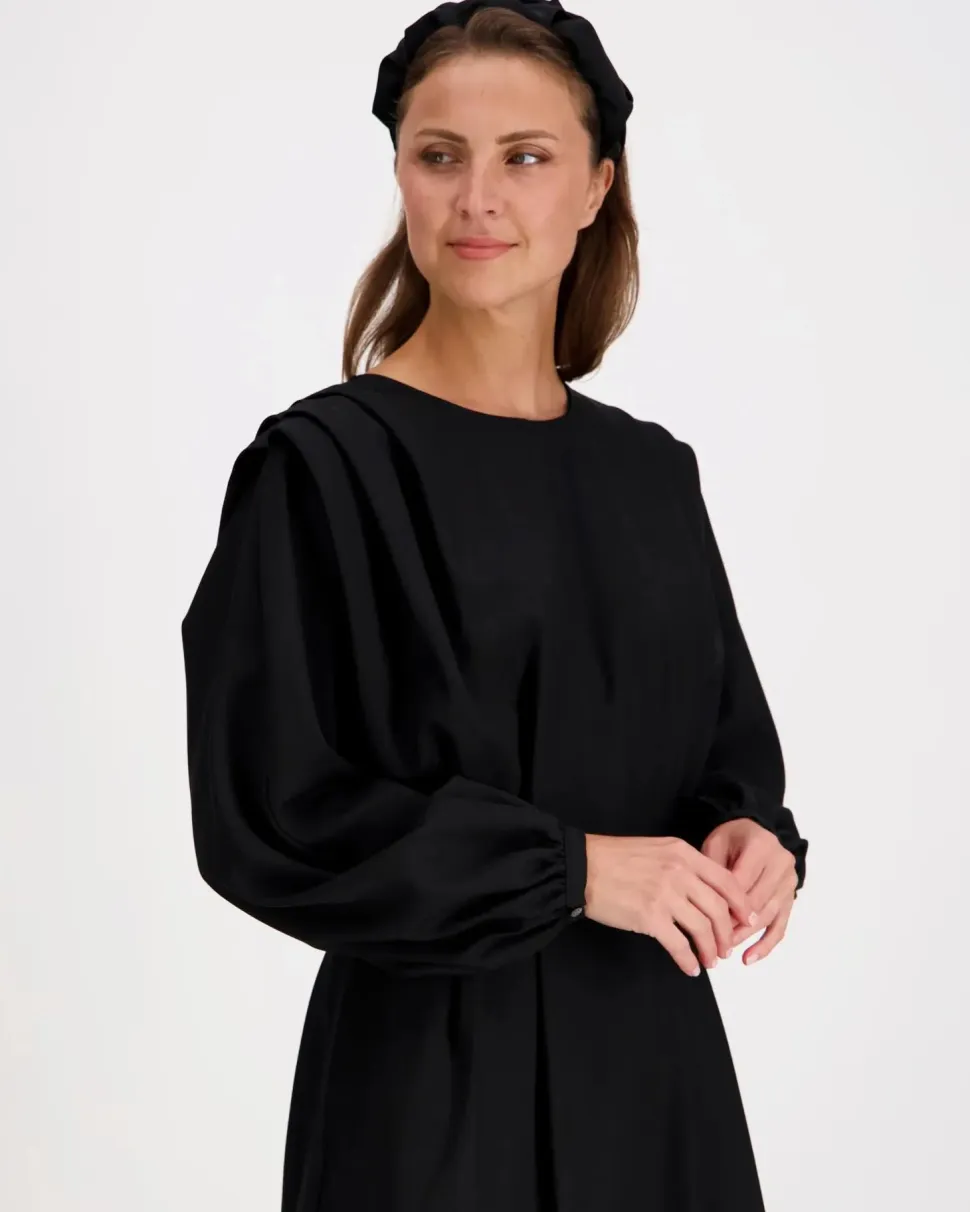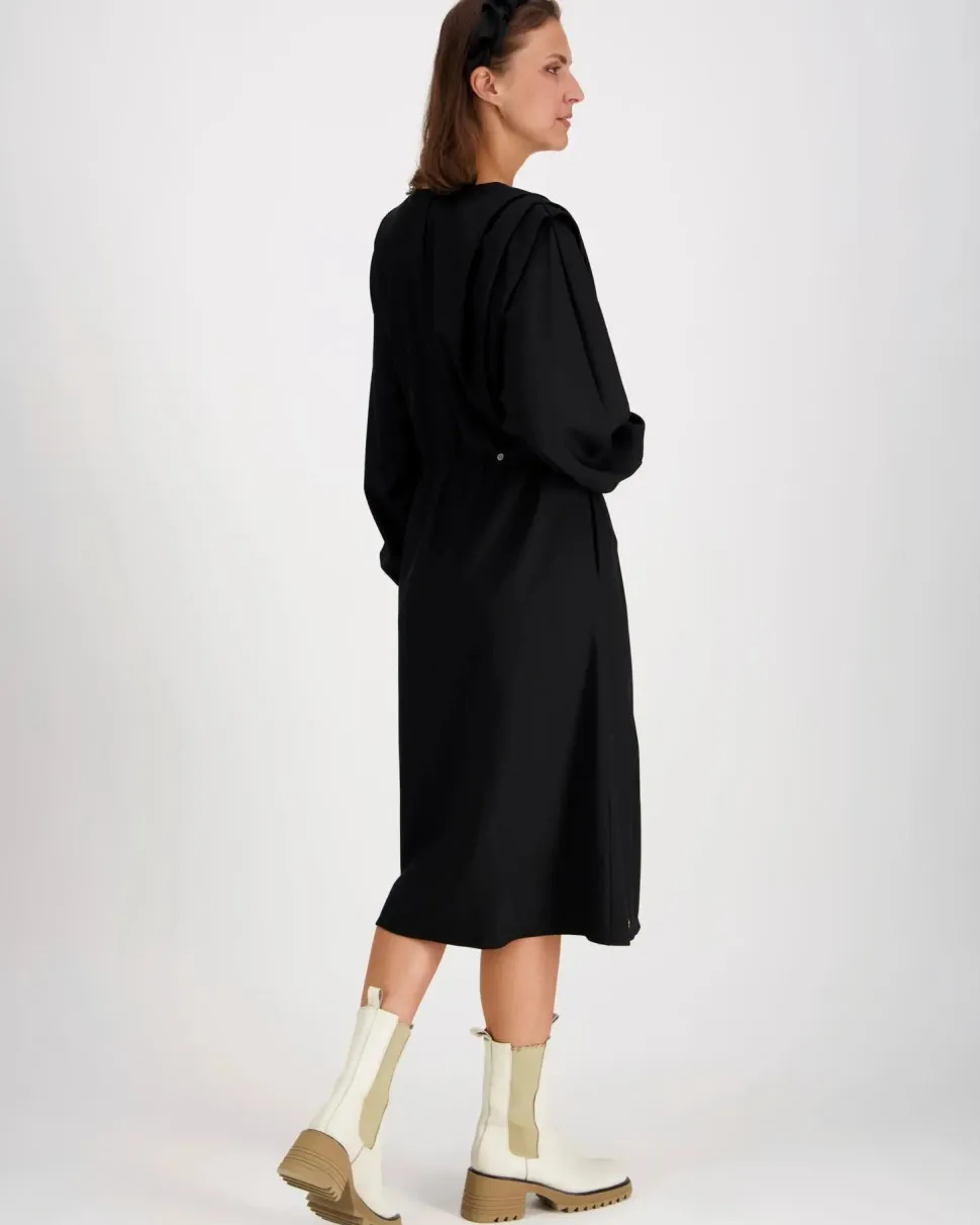 PBO Rani on elegantti naisten mekko, jonka ilme on suunniteltu tuomaan esiin naisellista charmia ja huoliteltua tyyliä. Mekossa on pyöreä pääntie sekä syvät, veistokselliset laskokset edessä ja takana, jotka luovat kauniin laskeutuvan ilmeen ja korostavat liikettä. Lepakkohihat kaventuvat hihansuihin, ja niiden nappikiinnitteiset hihansuut ovat tyylikäs yksityiskohta. Vyötäröllä sijaitseva tuplalaskos, joustava kuminauha ja nappisäätölenkit takaavat miellyttävän istuvuuden ja muotoa tukevan linjan. Mekon pituus on noin 113 cm, jolloin se on erinomainen valinta niin juhlavaan kuin arkeen yhdistettynä tyylikkäisiin asusteisiin ja kenkiin.