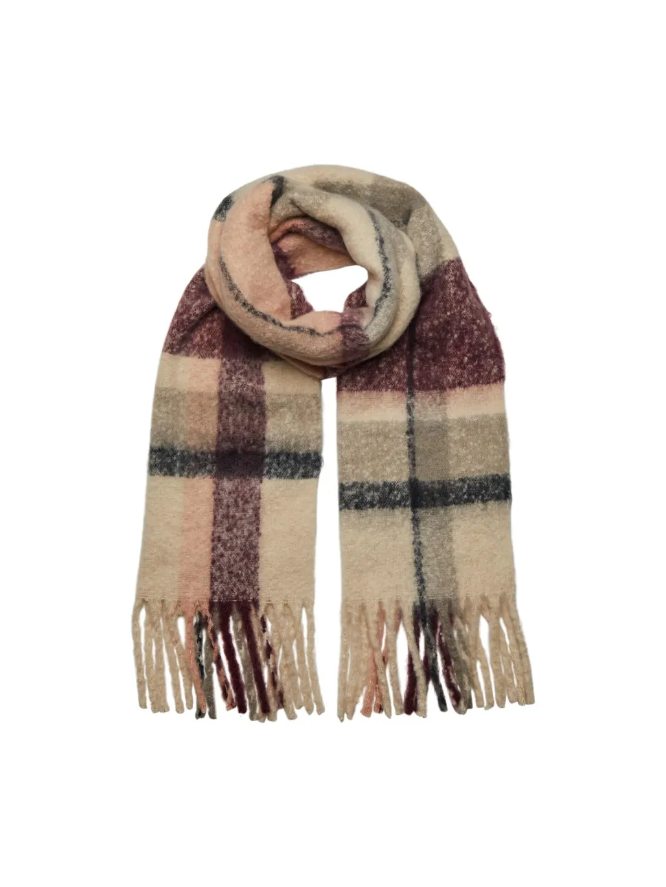 Pitkä, muhkea kaulaliina, jossa on hapsut päissä.